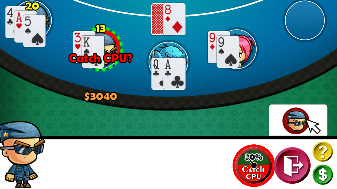 CHEATERS BLACKJACK 21 adds the 'Cheating' twist to the classic gambling game. Cheating steals the next card in the deck and swaps it with the worst card in your hand *IF* it improves your hand (Improve Hand or Avoid Busting). Play against Cheating CPU opponents to win match play and compare your scores to other player Worldwide!! CATCH CPU players to prevent them from cheating to gain advantage. CHEAT to Improve your hand and chances of winning BUT if the CPU players catch you cheating it could spell trouble since they can challenge you in a Old West type showdown for Cash.