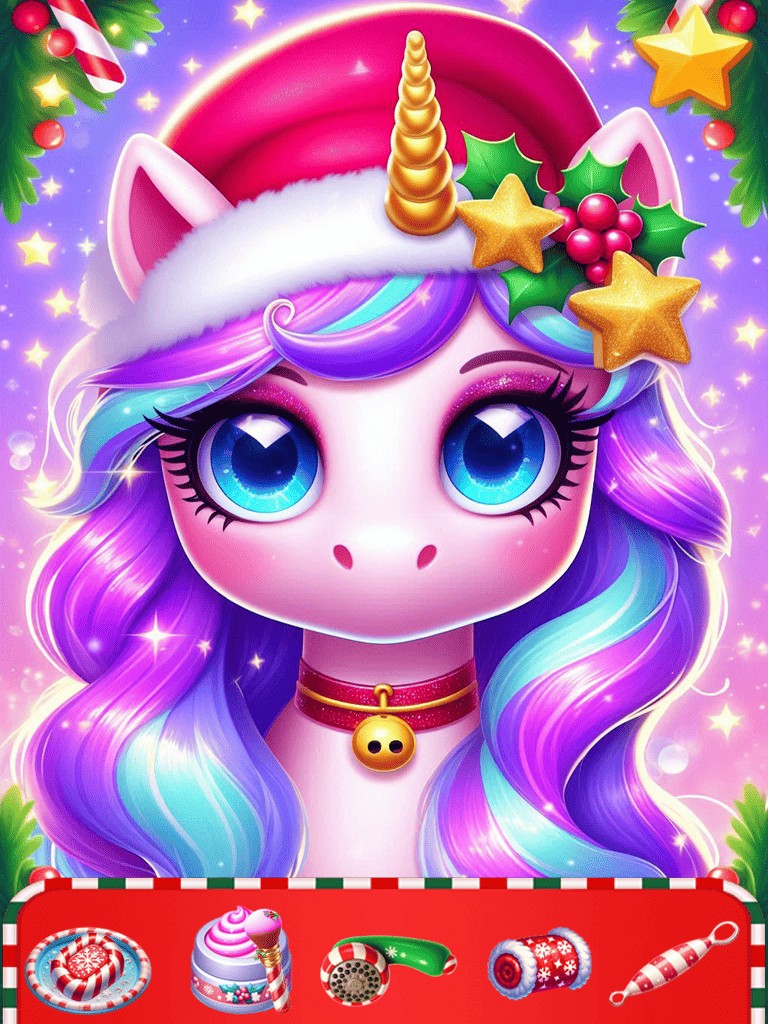 • Dress up & salon: Mix and match festive costumes, hairstyles, crowns and holiday accessories to create unique princess pony looks.