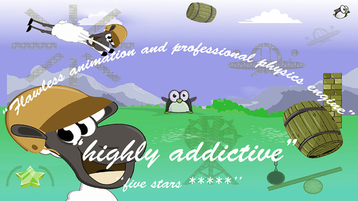 Launch the Sheep into the rickety cages holding the penguins against their will. Beautiful animation, flawless graphics, and professional physics engine that adds the fun and laughs to a challenging game that you won’t want to put down. Penguins can’t fly but the Sheep sure will! This fun and highly addictive game will have you coming back again and again for high flying, obstacle avoiding, sheep chucking good times!