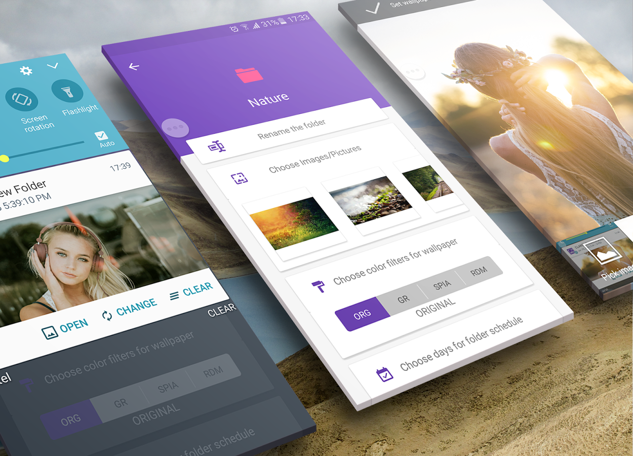 ✔ Choose Color Filters for wallpapers: Sepia, Grayscale, Blur, Random