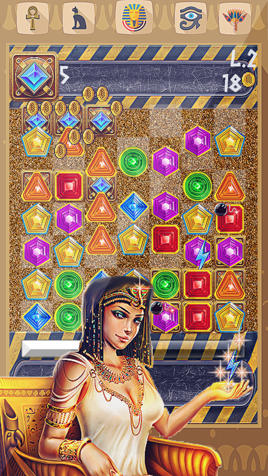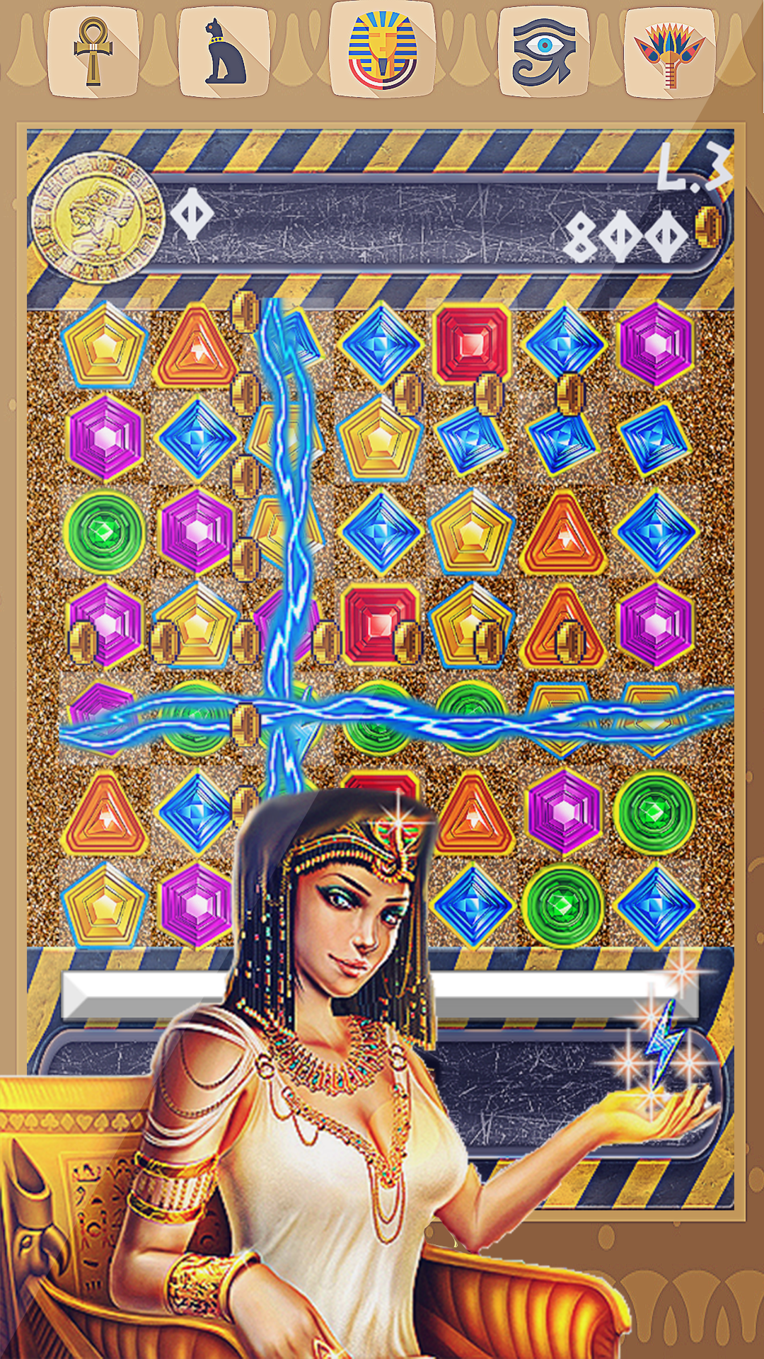 • PS: use the special jewels to make a difference when you play. The jewel with the lightning icon will stun & break line of Cleopatra's curses jewels, the jewel with the bomb icon will blow up a space of 3x3 jewels, and if you mixed the lightning with the bomb you'll get a double lightning with devastating explosion.