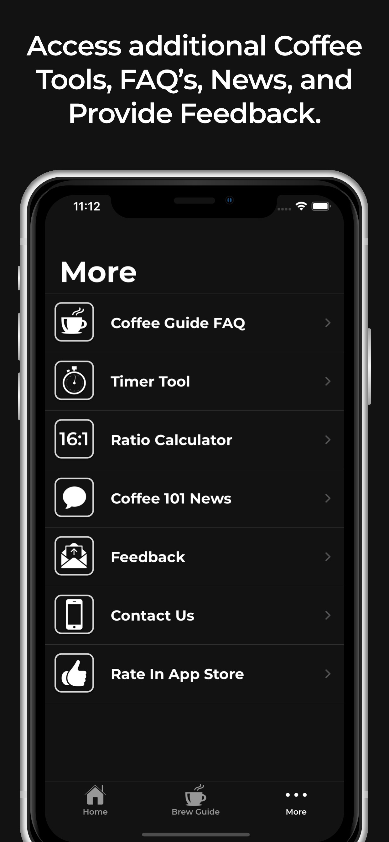 Coffee 101 also has a built in Timer that gives you the current step in your Brew Guide alongside the elapsed time. There is also a Ratio Calculator that will tell you how much Coffee to Water ratio you need by easily choosing how many cups you wish to make.