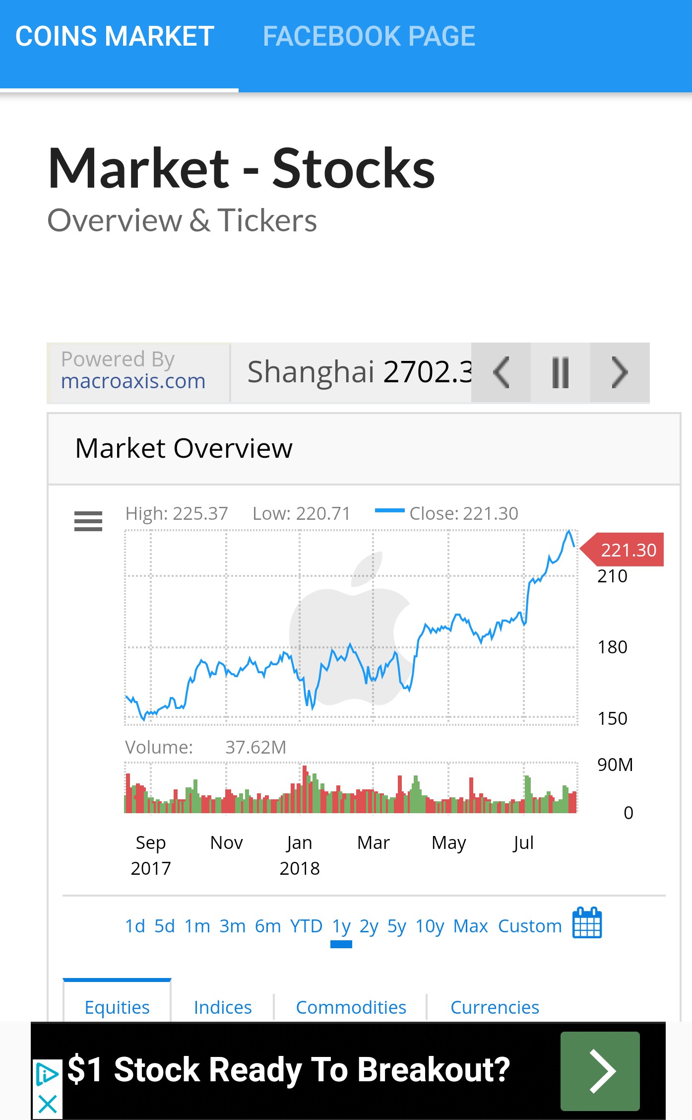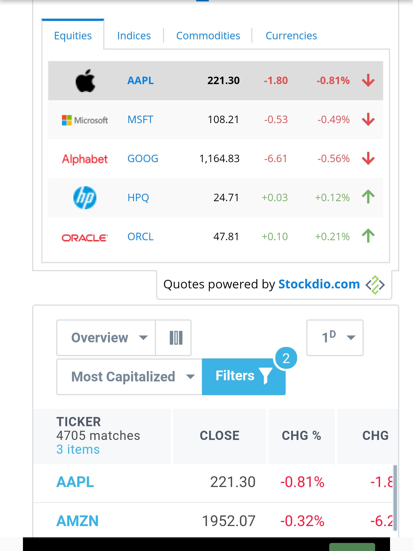 Live stock price market updates with sorting and filtering options, graphs, detailed statistics and a markets overview for the equities, indices, commodities, and currencies.