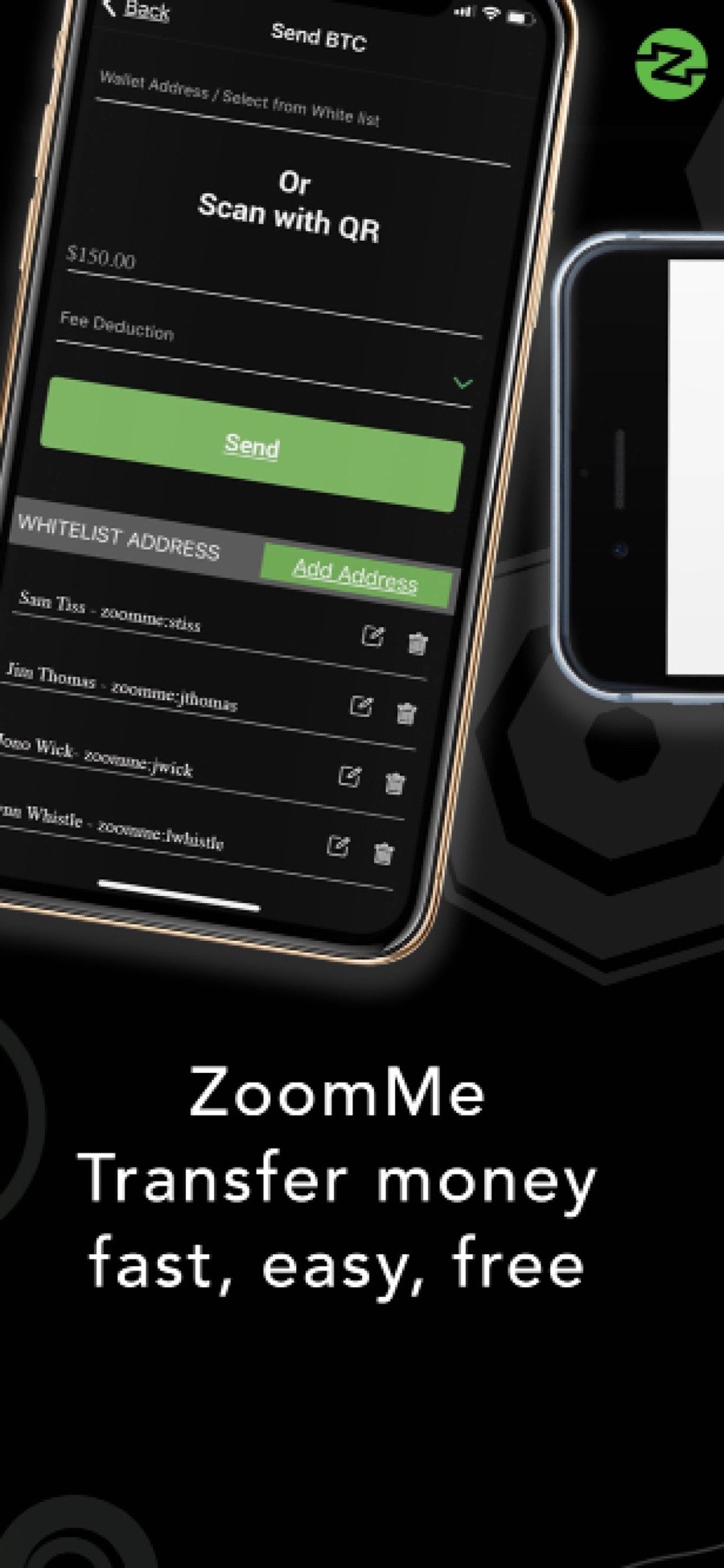 ZoomMe provides a free, easy, and secure way to transfer crypto/fiat across the globe. No longer will users have to pay expensive commissions for sending money or crypto to family, friends, or anyone else. ZoomMe is a free peer-to-peer service for all CoinZoom customers.