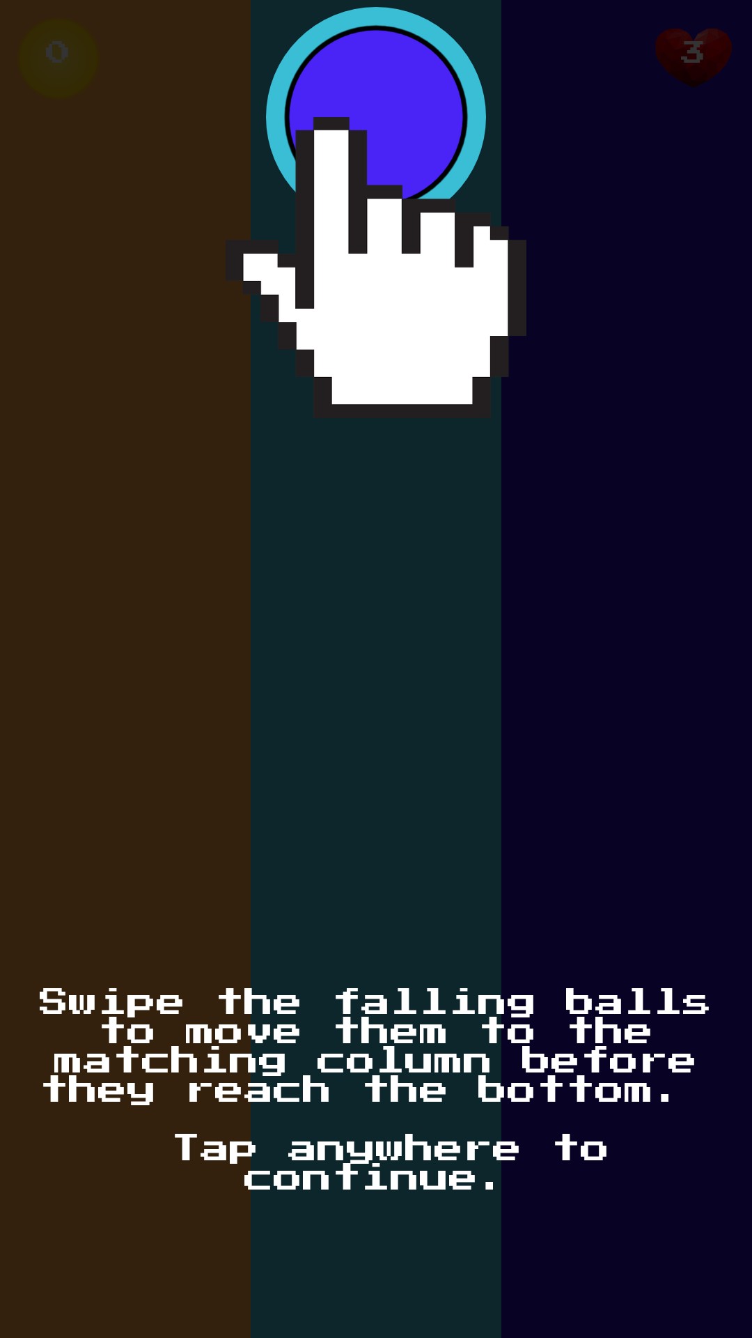 Balls of color fall down the screen. Be quick and swipe them to their matching column before they fall off the screen to score a point. You'll need good reactions - you only get 3 lives!