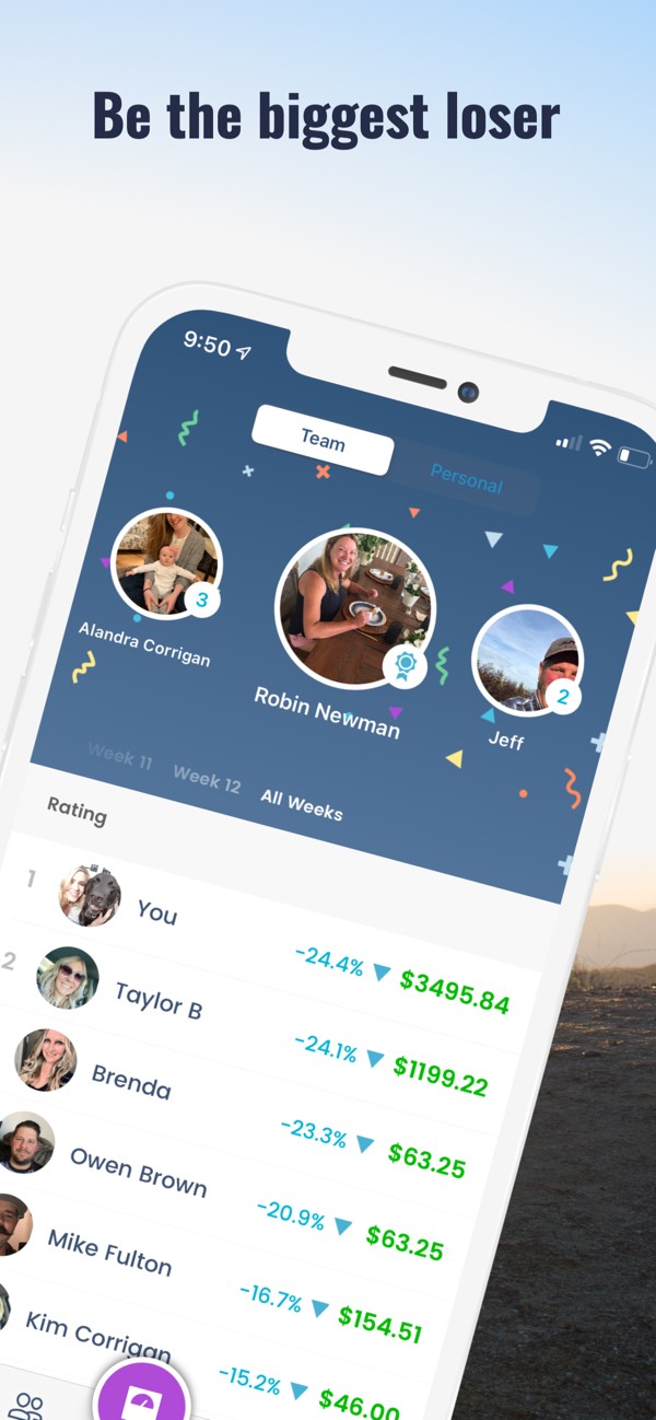 Our weight and body transformation challenge is a great way to motivate you to lose weight, both by yourself and together with your team. We calculate weight loss weekly so you can see how you’re doing relative to friends, and across the entire competition. This is a fun game for weight loss groups. If you want, this fun weight loss challenge with a friend app gives you the option to hide your weight - but still allows you to be the biggest loser!