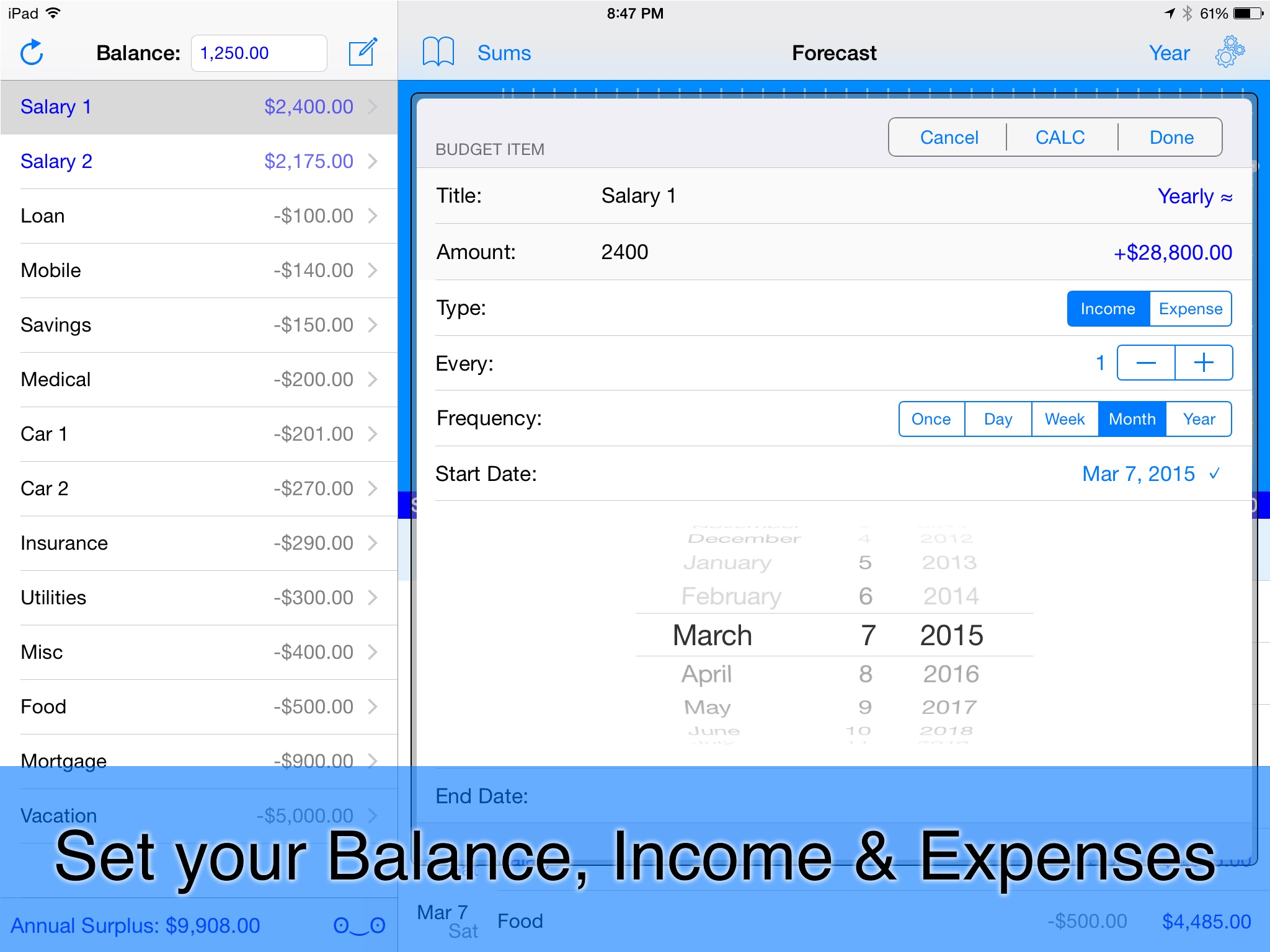 This absolutely FREE, simple, yet powerful App will help you manage your future Income and Expenses the way it was meant to be done! It's time to stop tracking how much you had on your account and look forward to the future and see what is possible with your current budget!