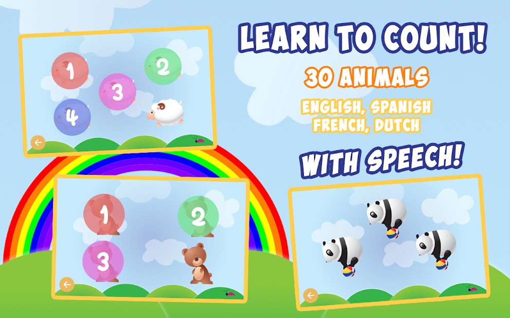 The counting for kids app includes 4 languages: English, French, Spanish and Dutch.