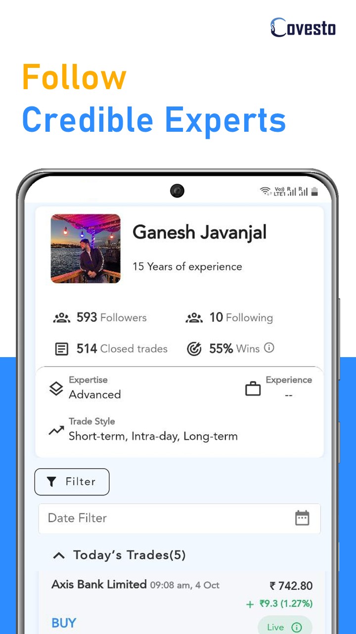 Trade virtually or for real, we keep a track of your investing performance and help you upskill your trading game. We offer a simple and convenient platform where users can also discover credible stock market experts, view their verified performance, and track their live trades & portfolios. Covesto is a community based platform which offers transparency into expert’s profile and helps build the missing trust factor.