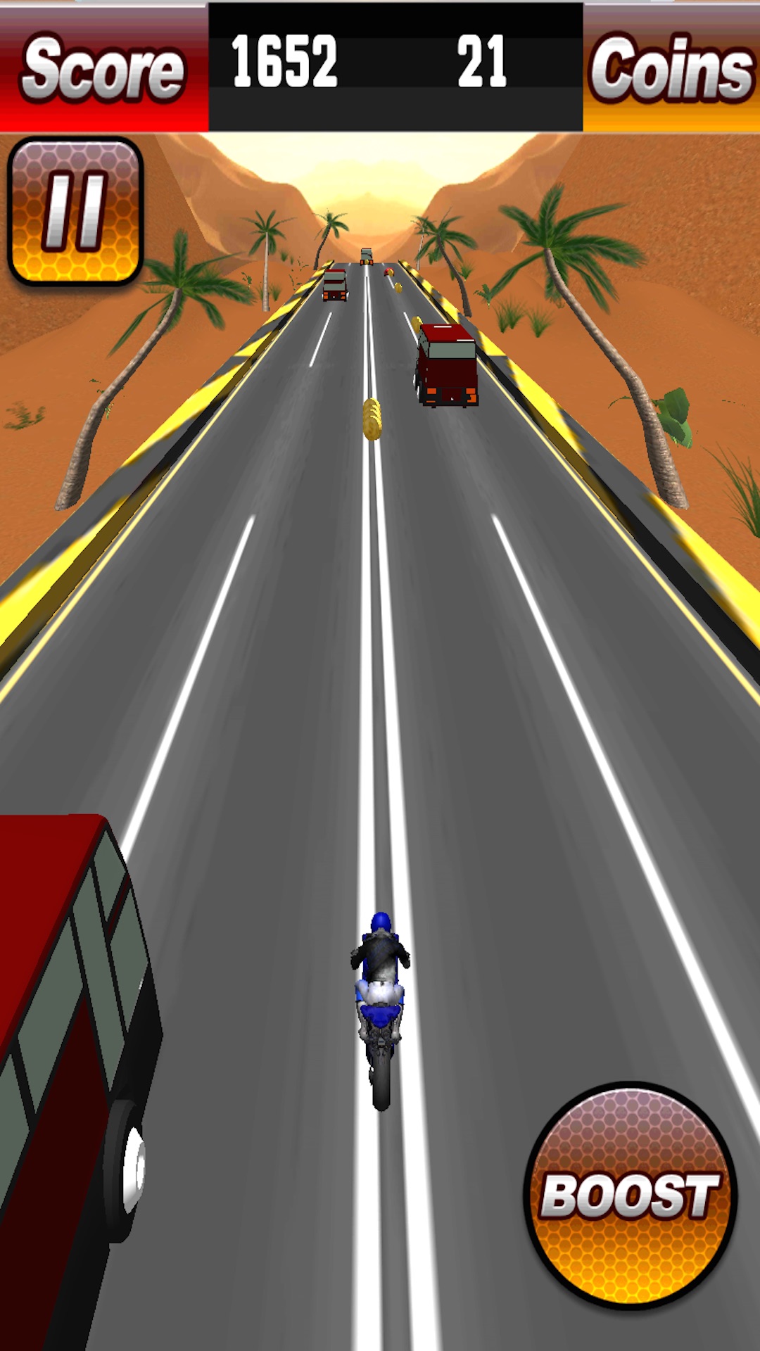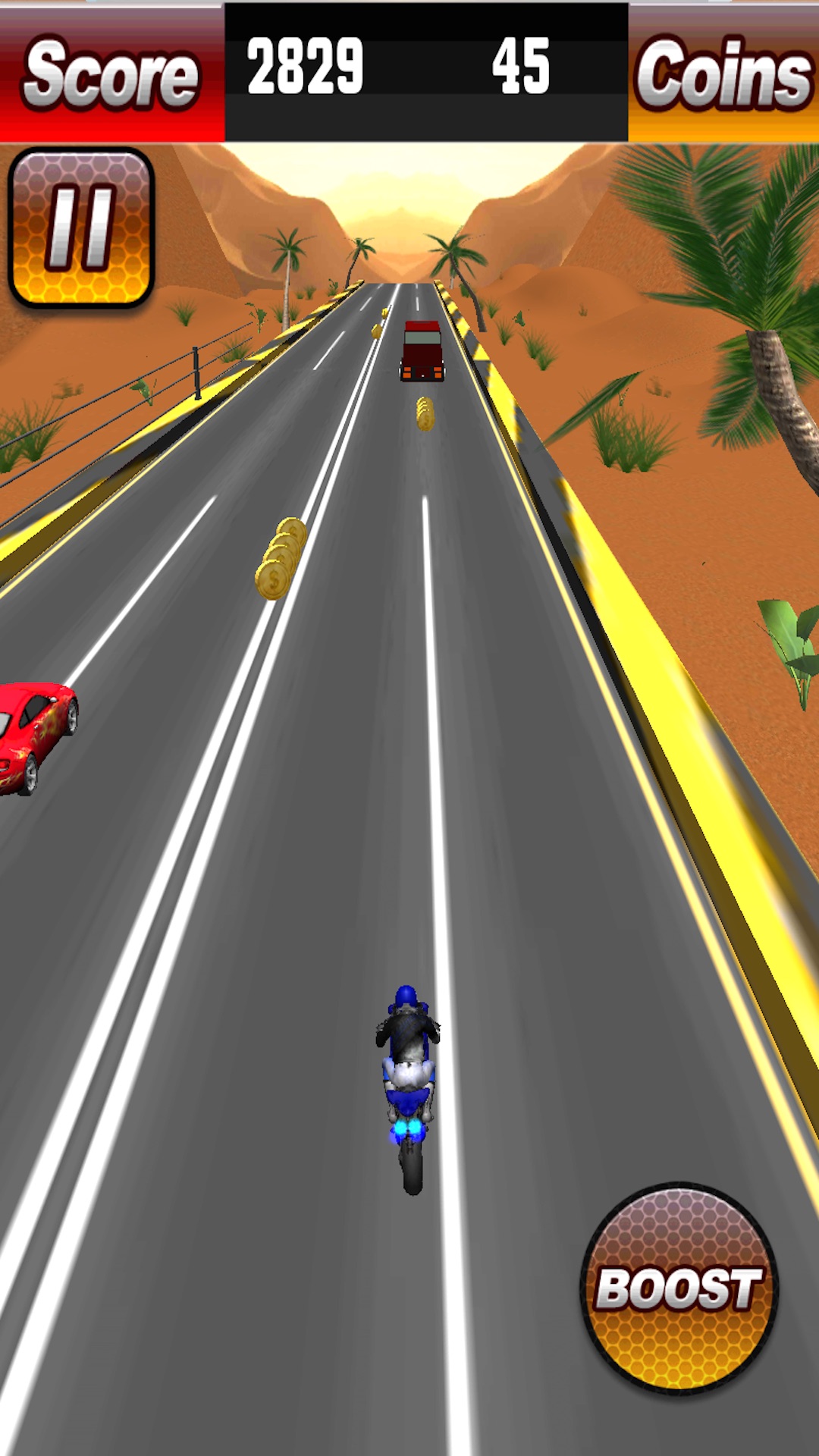 Crazy racing motorcycle is a fast paced racing game. You can experience premier motorcycle road racing in the real world! Control your motorcycle with incredible fast speed in traffic rush time! Also enjoy a beautiful view during the journey - desert, city, bridge, sea and forest.