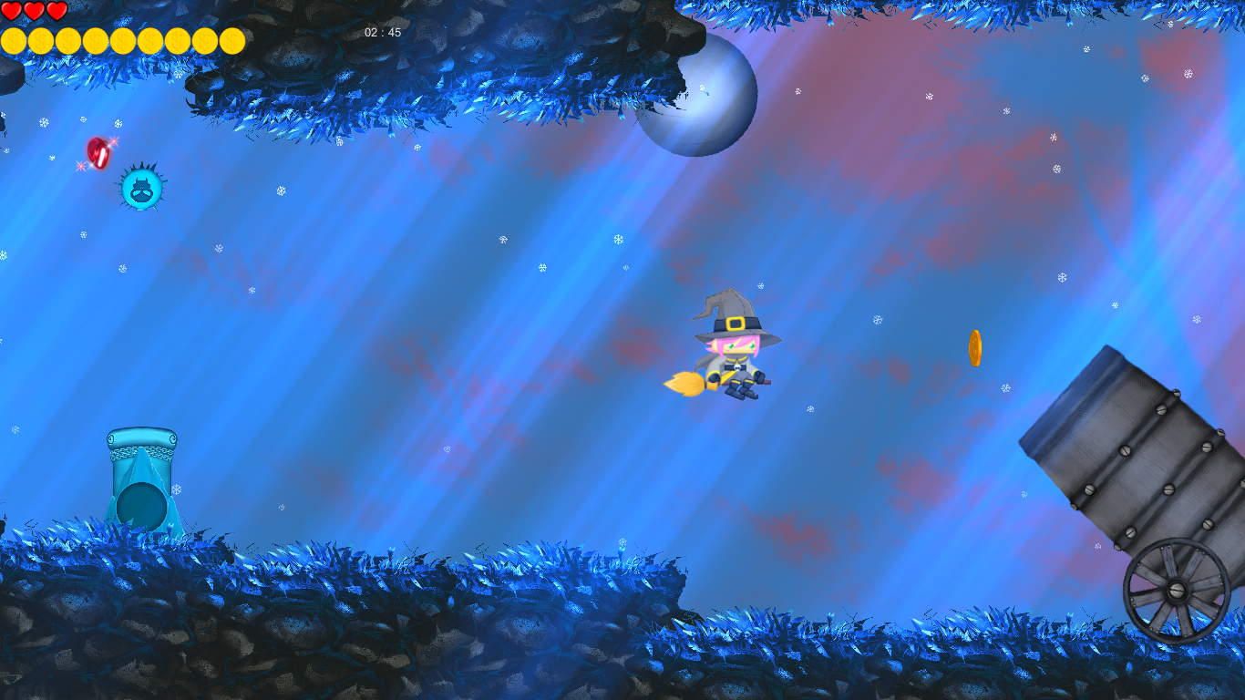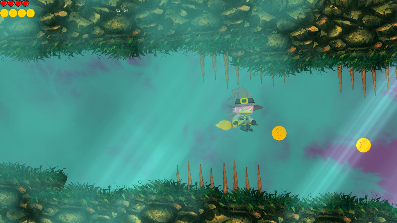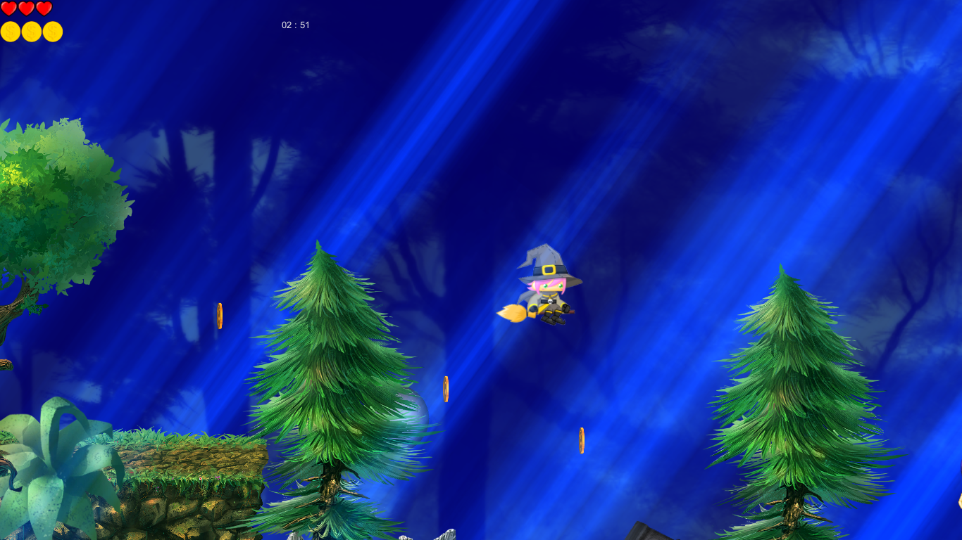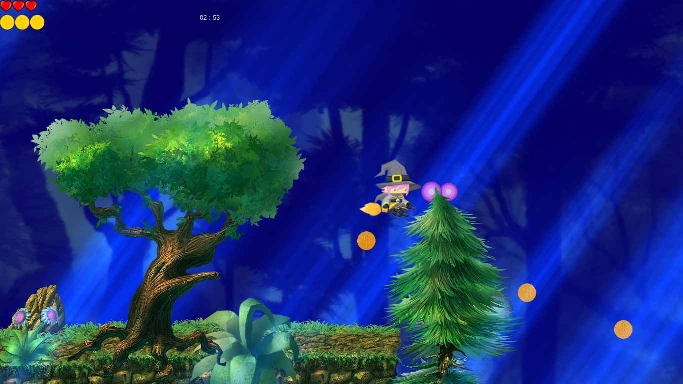 Mission is fly through magic forest which contains enemys and traps. Our hero is witch who can fly and shoot magic balls. You should collect coins because every tenth coin crystal will give you one minute addtional time,