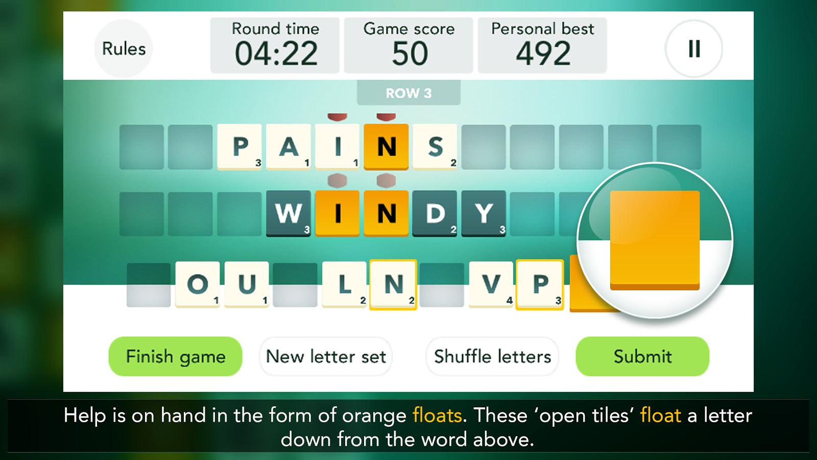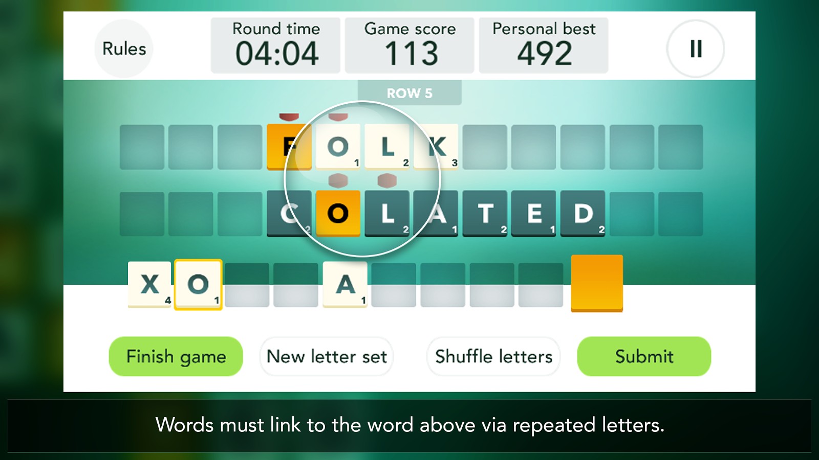 The rules are simple. Using the letters in your rack, compose a word and place it on the board. For the game to accept the word however, you must spell it correctly and it must link to the word above. Words link via repeated letters.