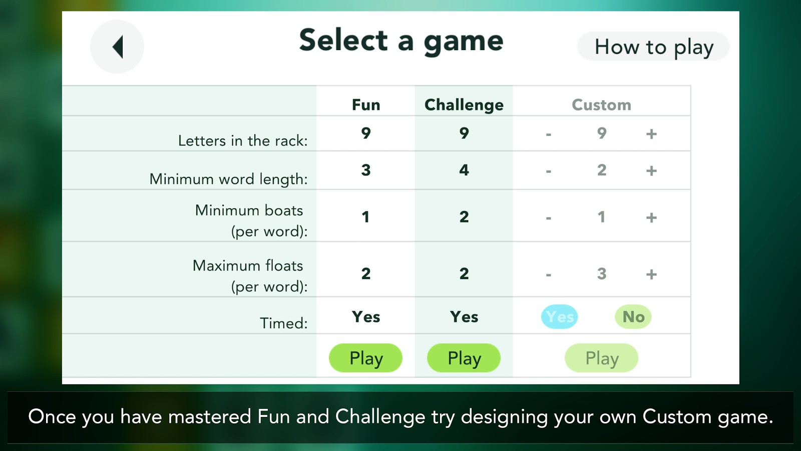 If you started with the ‘Fun’ game, then perhaps it is time to try ‘Challenge ‘– which is a little harder. Want to change games again? That’s easy. There are endless game configurations available because you can configure the games yourself.