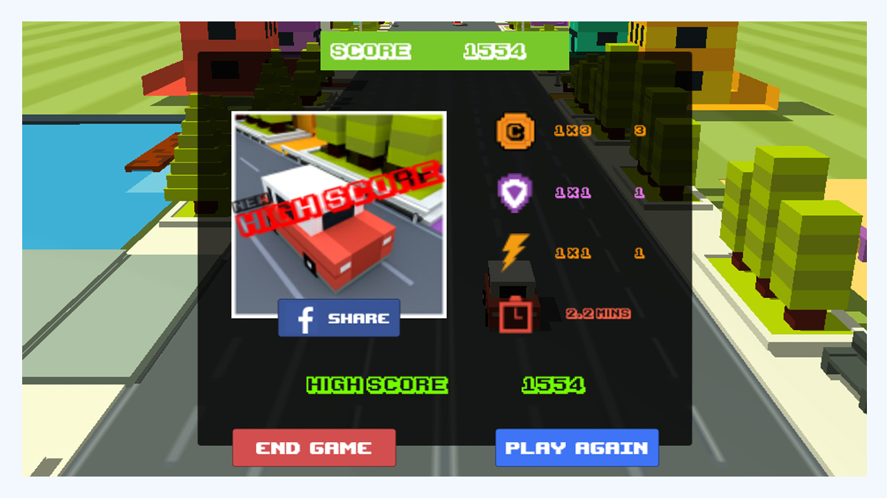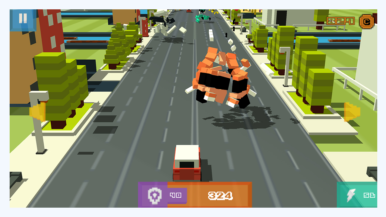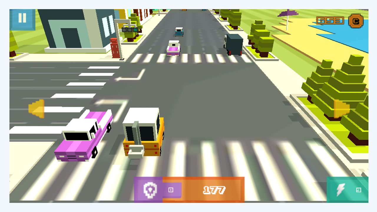 Crossy Drive, a fantastic driving game to play. Choose vehicle of your choice and score big. Collect shield to protect your vehicle from crashing, explode other vehicles to clear your way using exploder. You can collect/purchase coins, shields and exploder on the way. Use coins to unlock vehicles, get extra shield and exploders.