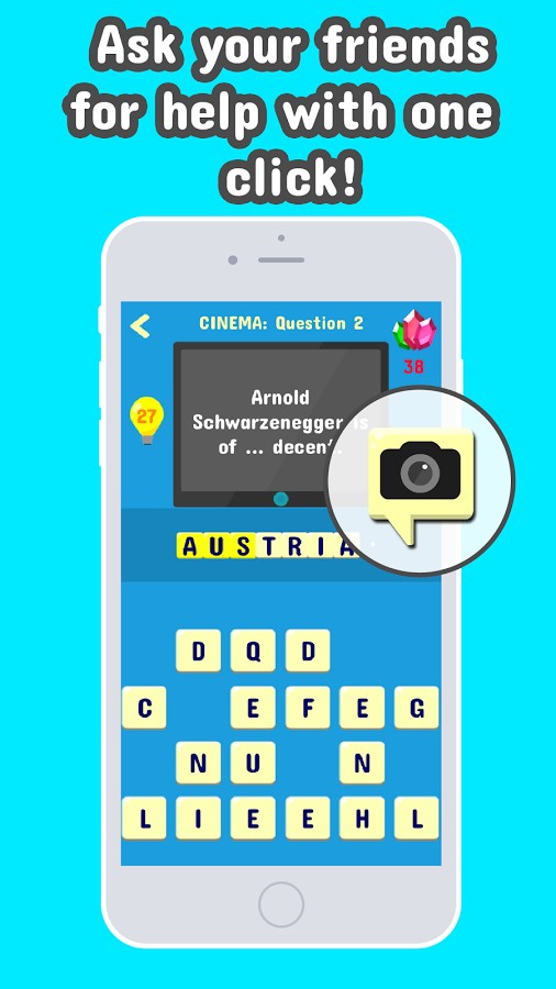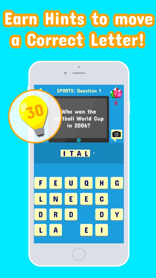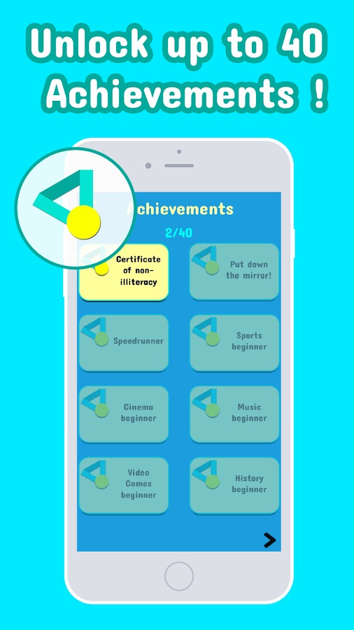 What is a game without Achievements? Even a trivia word game can have some! Unlock up to 40 cool and tricky Achievements, tap the achievement box (in the Achievements section in the main menu) to show how to unlock each one of them!
