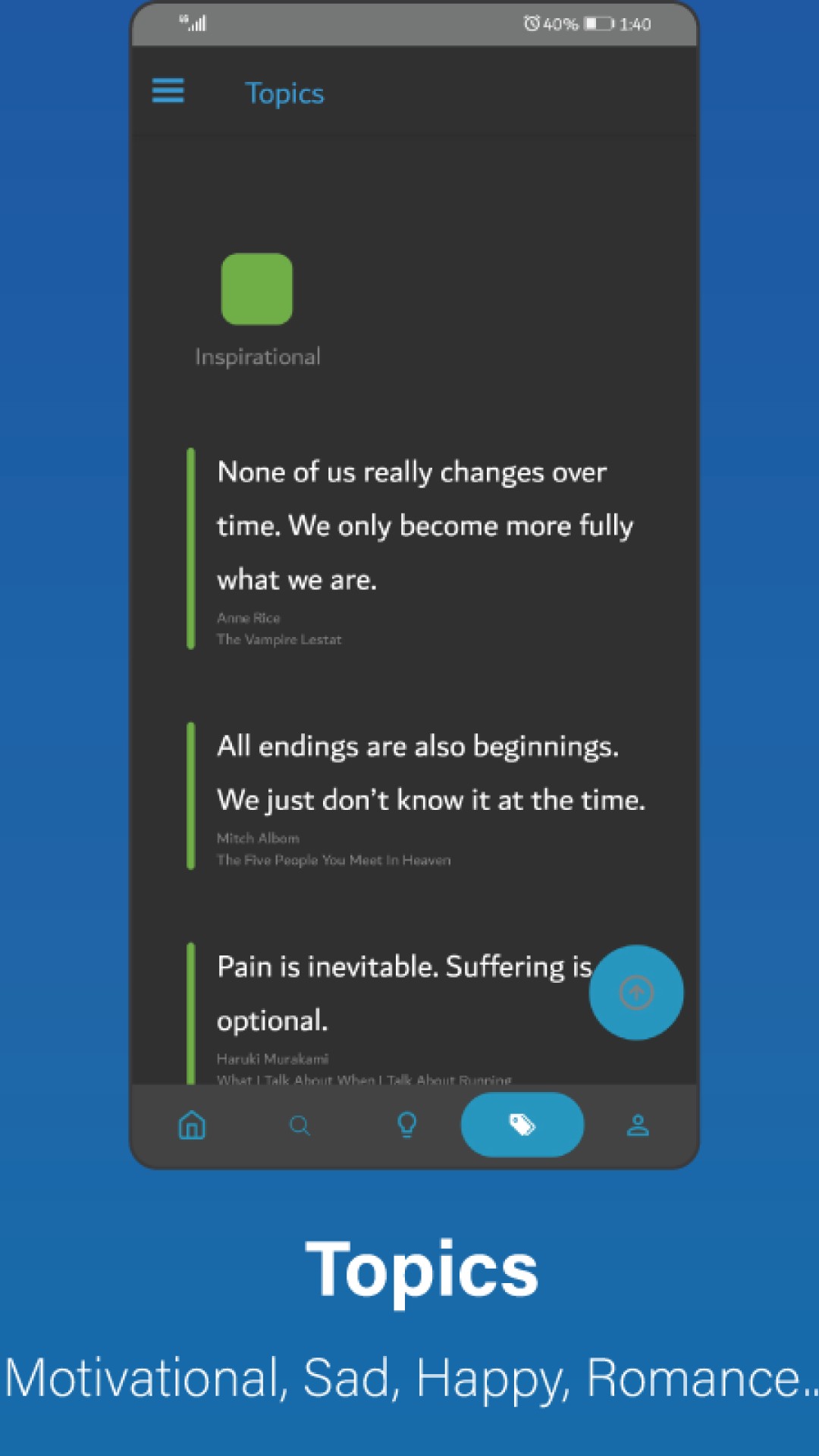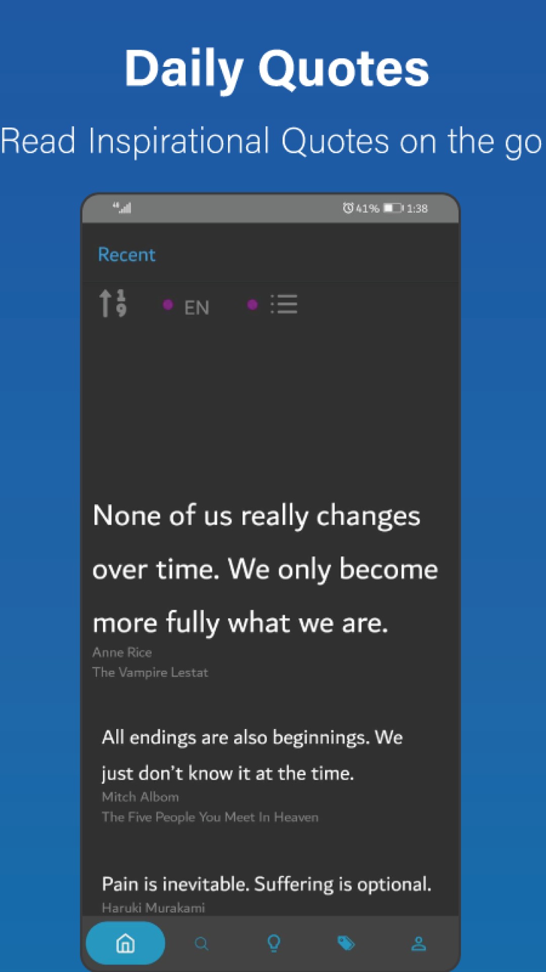 Our Inspirational Quotes application is loaded up with motivational statements and truisms that fill in as sure updates for the duration of the day the Quotes application is located. change your existence with the force of inspiration, join the large number of cheerful clients who use motivation as a component of their daily practice to streamline their regular prosperity. Our positive updates are an incredible, successful way of keeping yourself going when challenges are out of control and to remain enlivened when going after new objectives and dreams.