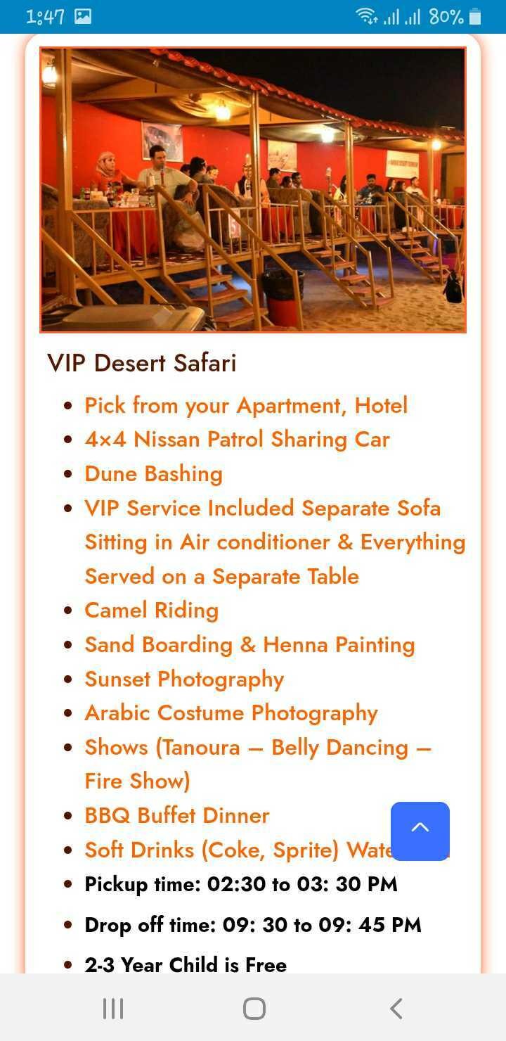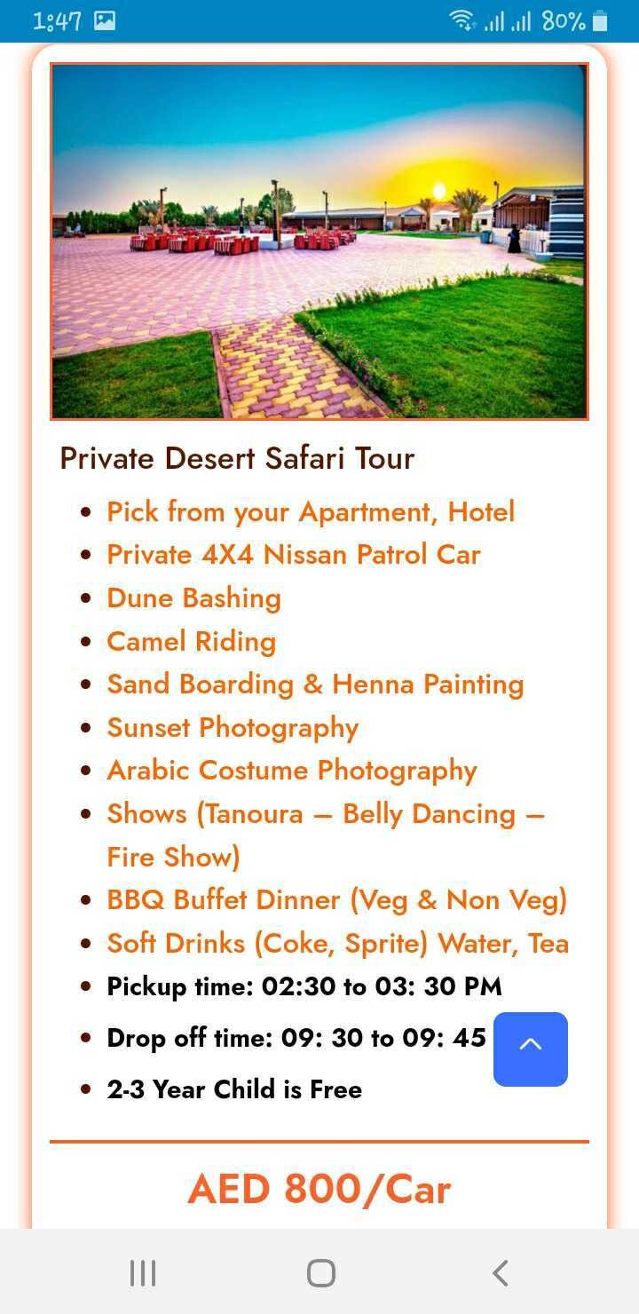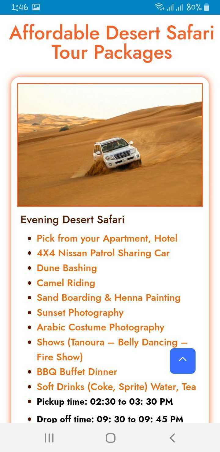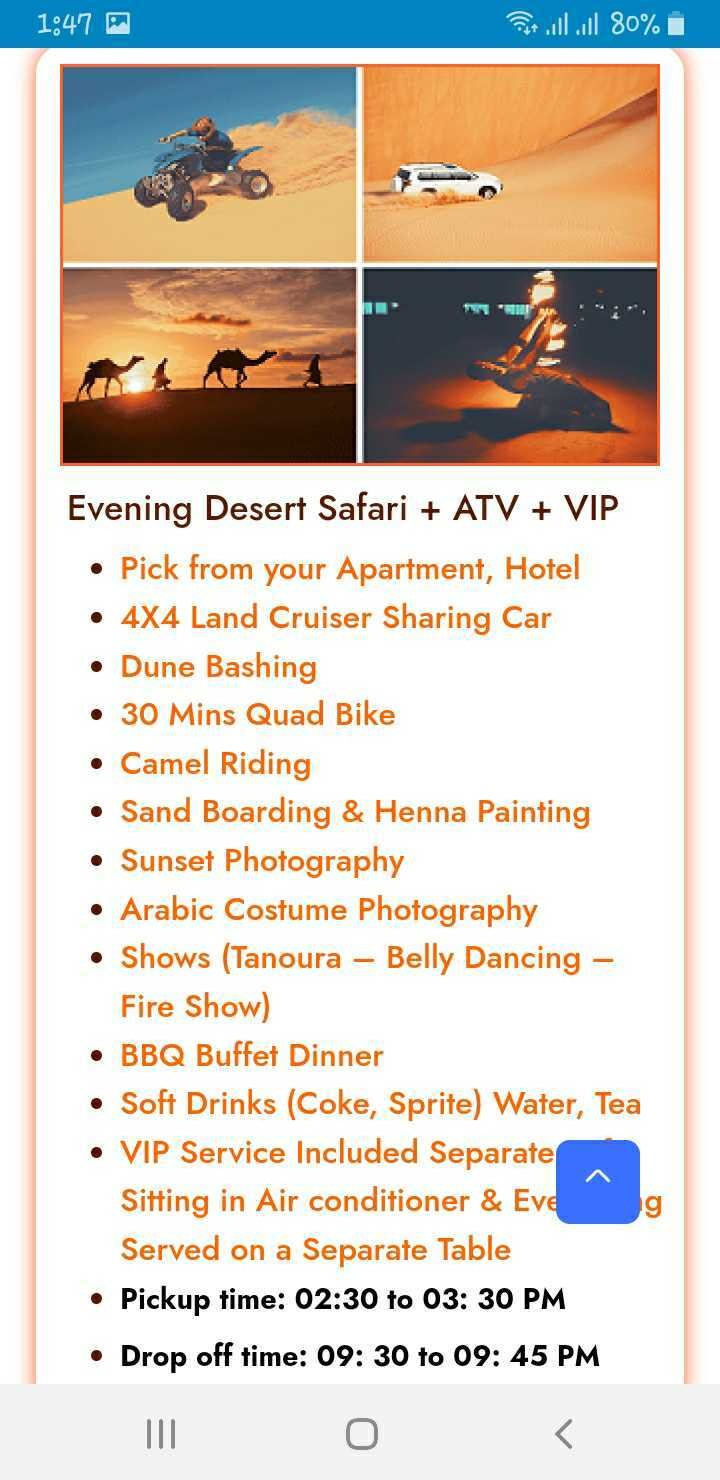 We treat our delicious BBQ dinner menu with veg and non-veg options to our clients. Desertbookinsgs’ desert safari tours include evening desert safari, morning desert safari, private desert safari, overnight Desert Safari, Evening Desert Safari + ATV, and Morning Desert Safari + ATV.