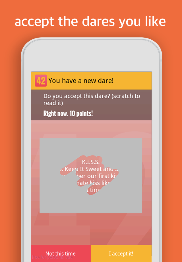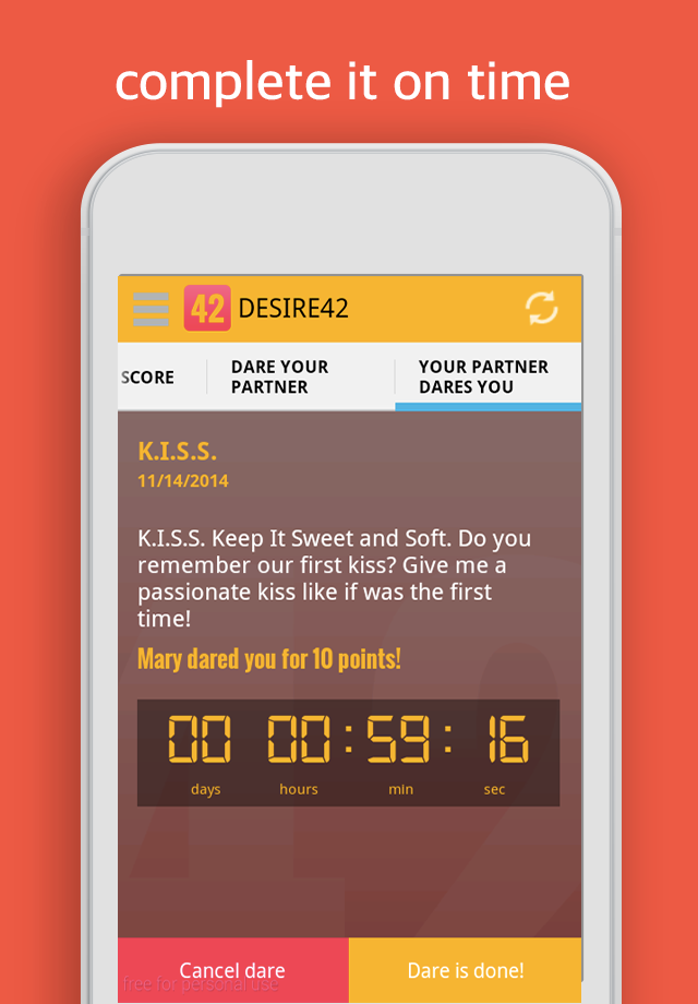 DESIRE 42 is a fun way to dare your partner! It’s free, it’s fun, and it’s completely private! DESIRE 42 is perfect for both long-term relationship and new couples.