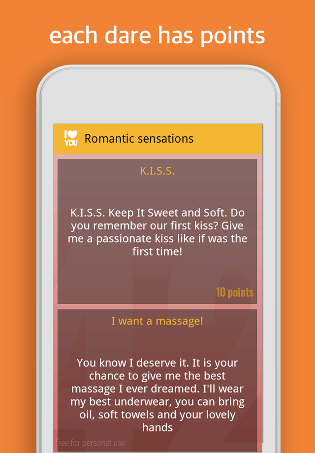Send your favourite dare from any predefined category: 'Romantic sensations', 'Roles and fantasies' and much much more! Dares are updated constantly. An app for couples that want to have fun! Do you feel creative? You can also write your own dares!