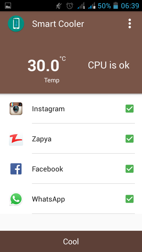 Its controls the extra usage of memory and release some memory that are occupied by some background running apps. Device cooler works in a perfect manner to clean, release your memory, gives you a real time protection and keeps your phone cool and normal against high temperature.
