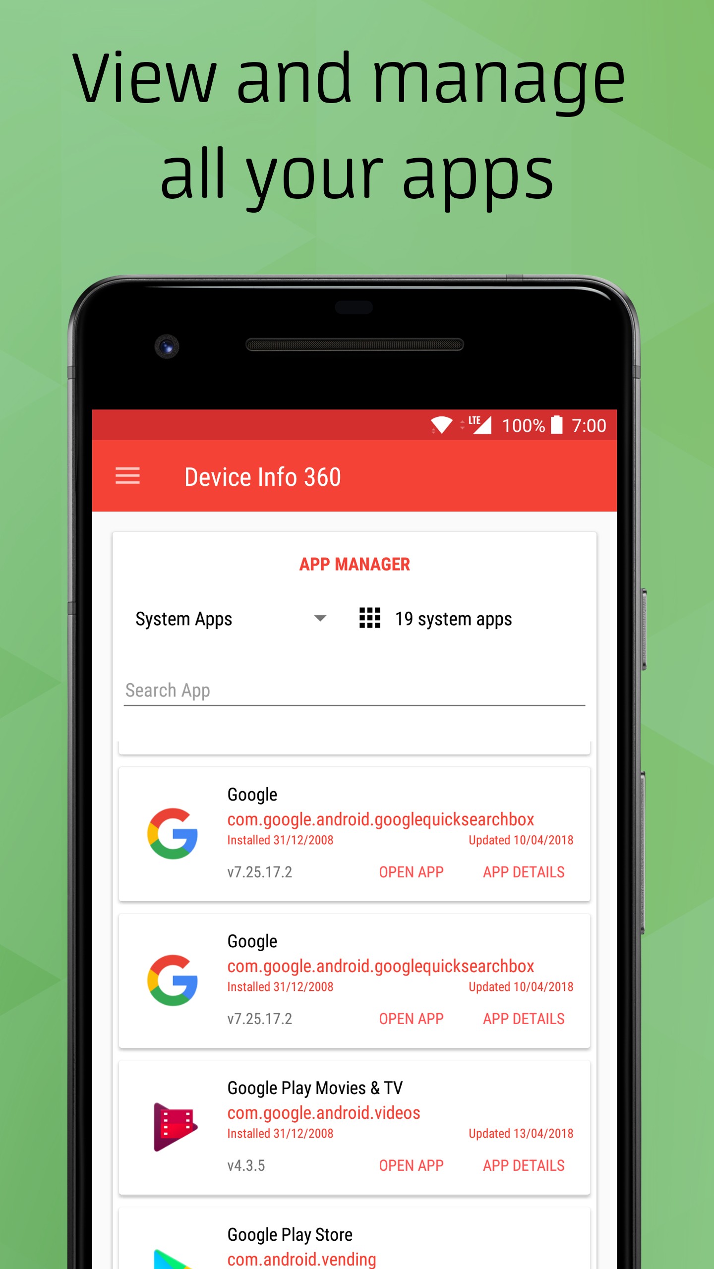 Know everything about your Android device with Device Info 360. Know all the essential details of your device, view or manage apps and check your device for root access.