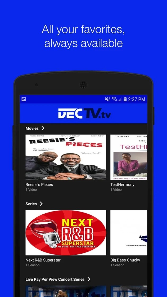 We deliver content that universally speaks to the changing lifestyles of audiences everywhere. DECTV Network's signature content is live-streaming music concerts that give members an up close and personal experience with the celebrities they want to see.