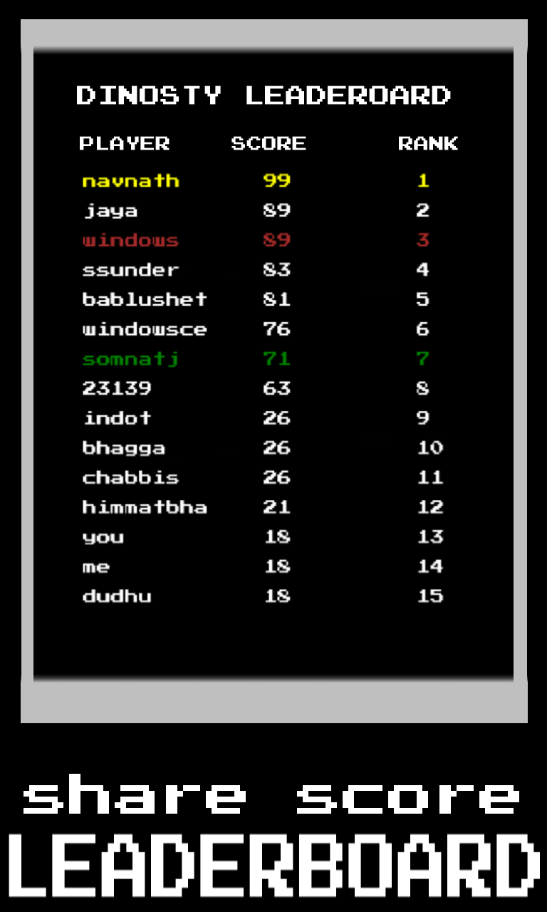 - make your best score and compare it with players worldwide with Dinosty Leaderboard