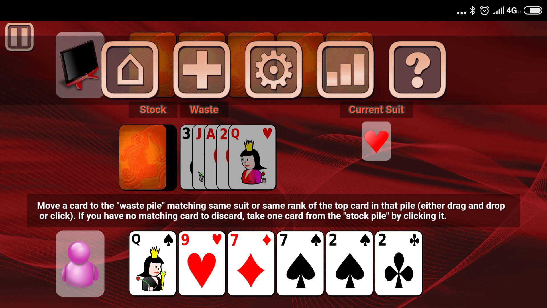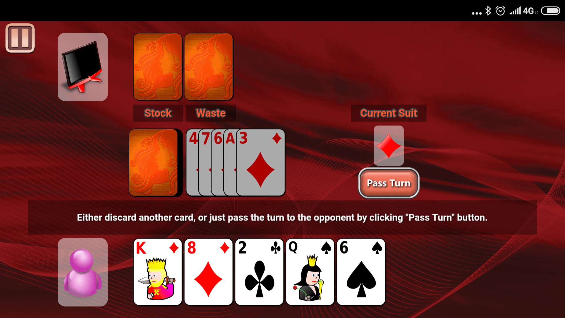 In each turn player is supposed to discard one or more cards. If player has no matching card to throw, he/she must pick a card from the stock pile. Player can discard a card only if it matches either the rank or the suit of the top card in the waste pile. There are additional rules which must be followed while discarding a card.
