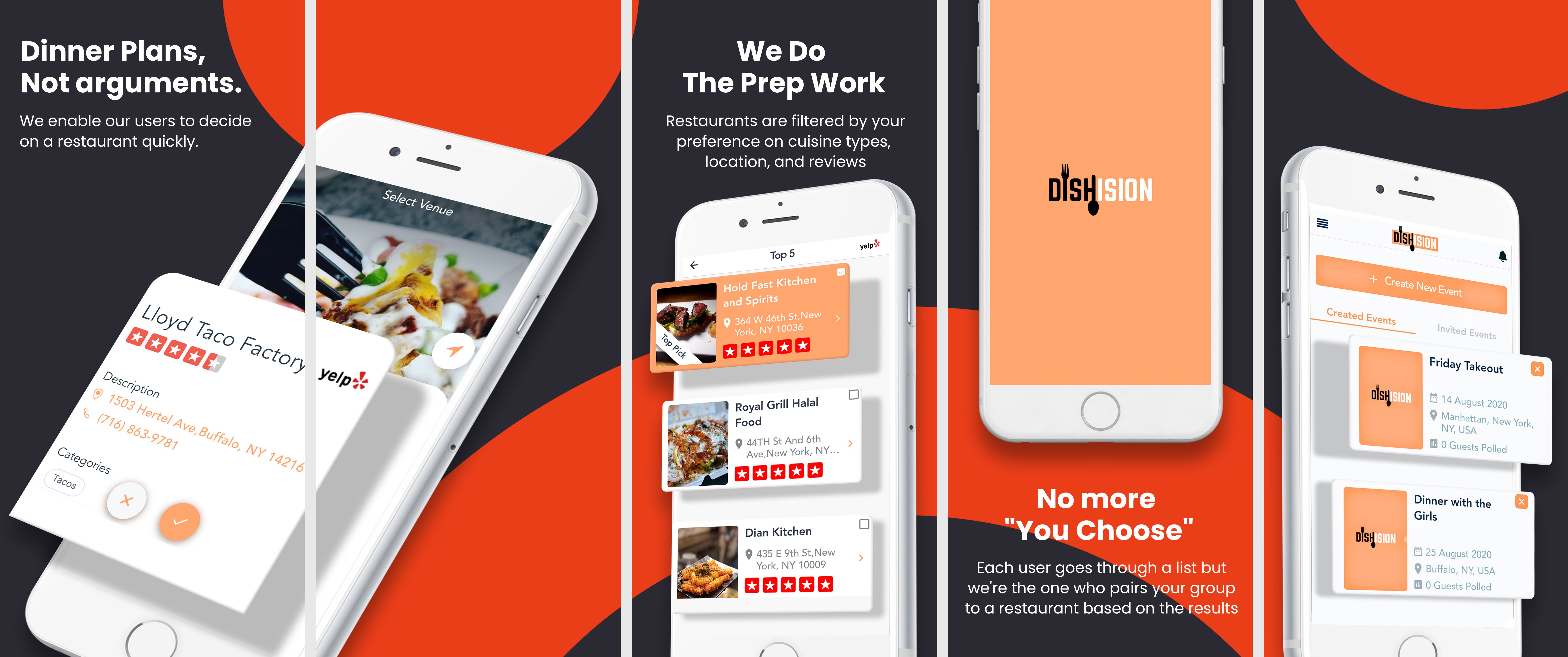 Nobody can stand the "Where do you want to eat" conversation. The endless "I Don't Care" and "You Pick" responses are the most annoying. Dishision set out to eliminate the argument, connecting users to their restaurants quickly and without conflict.