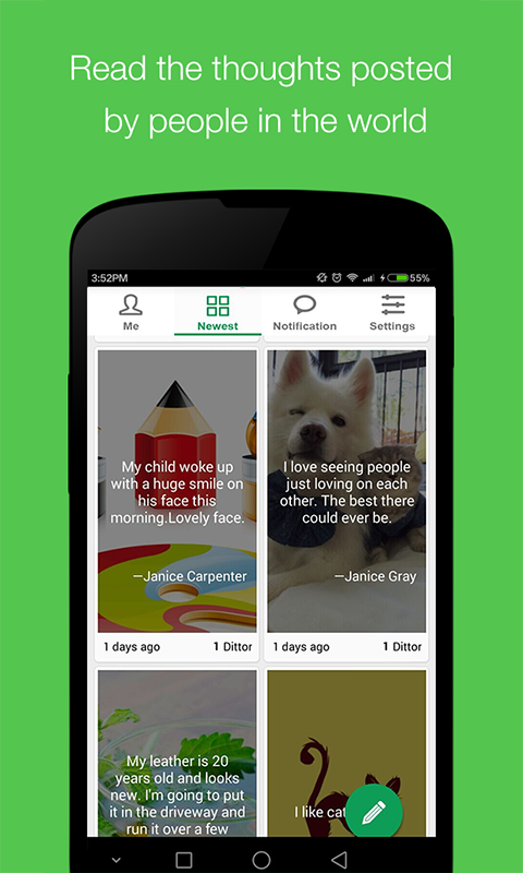 Dittor is a free anonymous social networking for sharing thoughts, ideas, conception and secrets. This is a place that you can express yourself and chat with strangers. You will find that you are never the only one in the word with the same ideas. You may even find a lovely dating here. Posts from all round the world let you find out the interesting things going on.