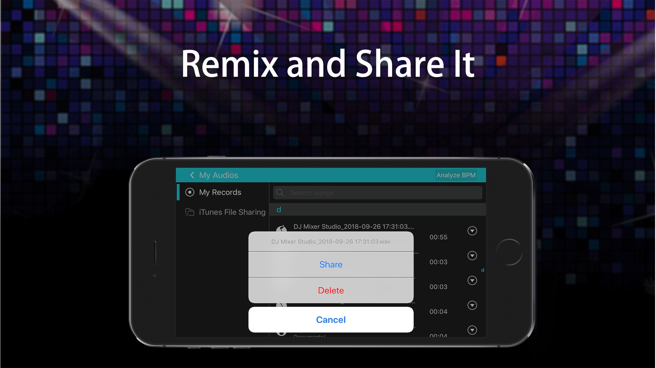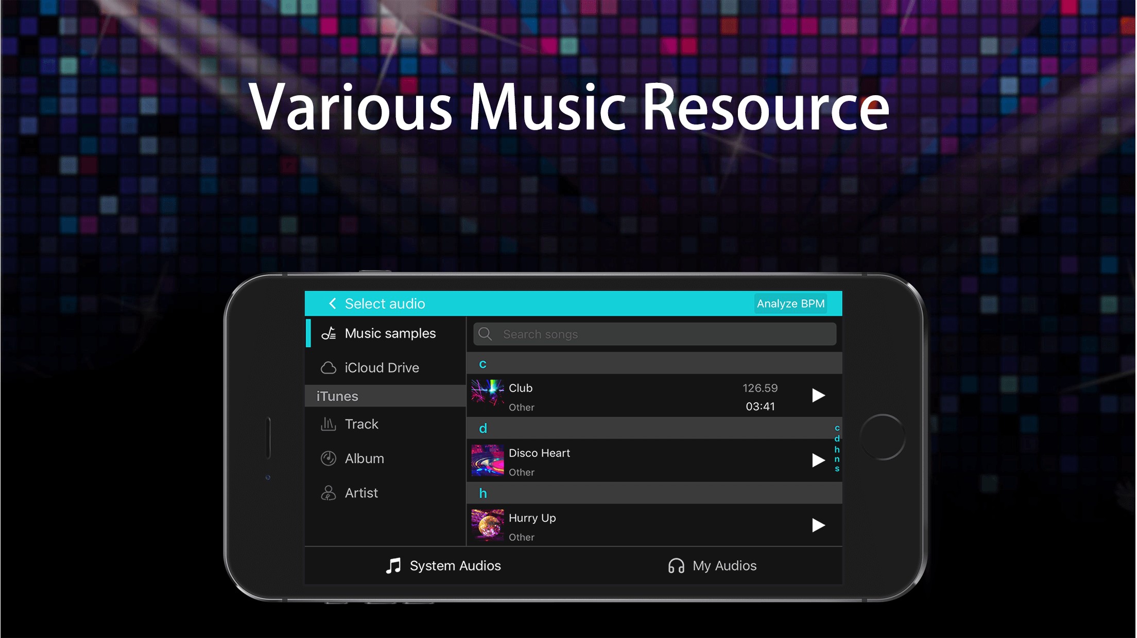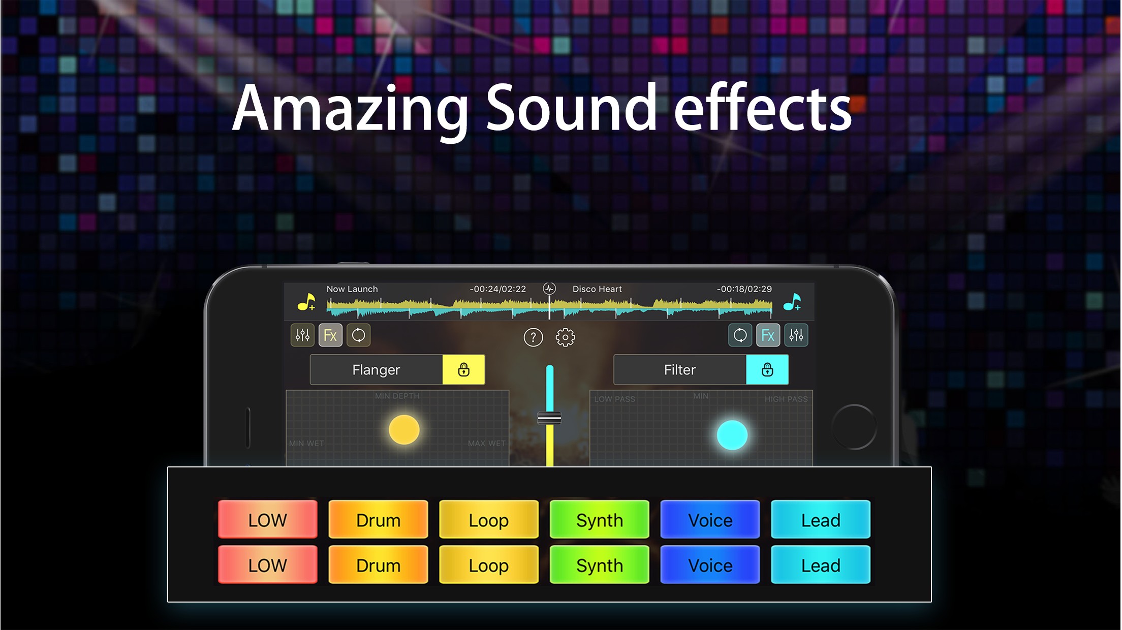 Integrated with your iTunes music library and iCould music, DJ Mixer studio gives you direct access to all your favorite songs and playlists instantly. You can make crossfade effects between two tracks seamlessly and change the tempo & pitch in real-time. Different built-in melodies & sound effects are also available to mix with your favorite music!