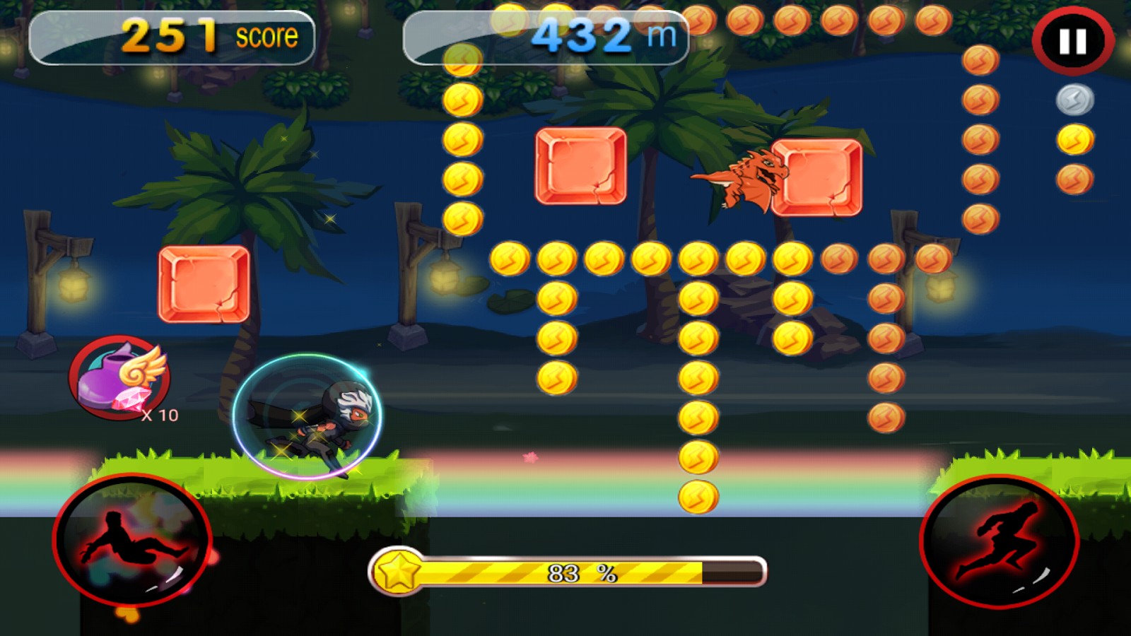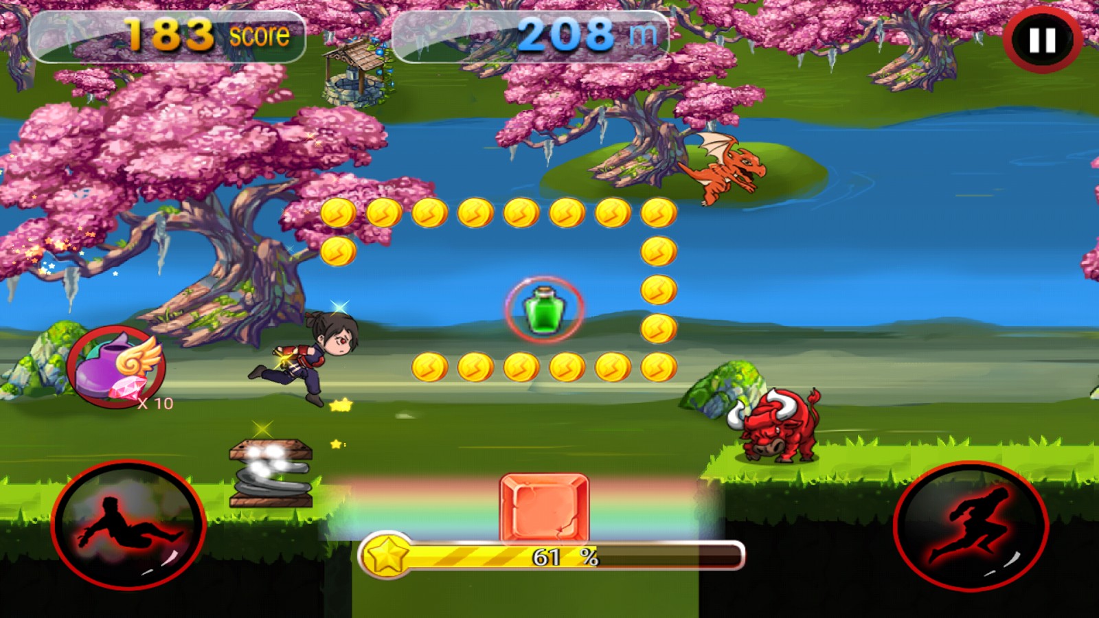 Do you think being a Ninja Samurai Champion is easy? Run, slide and jump through challenging levels and race your way to the top of the league. Beware of flying shurikens and booby traps, such as spiky bamboo, walls and holes. Watch out for the lurking angry red bulls, as they will try to stop your quest! Overcome countless booby traps, defeat enemies, and avoid the deadly shurikens; this is the play rule in this fun game. Grab shields, flying rockets, power-ups, giant potions, magic wands, springs, rainbow bridge, flying stars and powerful magnets. You have to be strong, fast and be stealthy. Collect gold and gems to upgrade your ninja power ups, you can also gather mounting animals and pets to strengthen your skills. Be the ultimate shadow ninja!