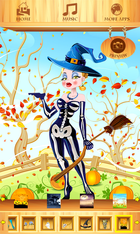 There are a lot of colorful and funny hairstyles, cool masks and crazy Halloween makeups. Your Halloween girl wants to be the most attractive at the party. Combine your set of wonderful makeover costumes, such as witch, dracula, frankenstein, devil, ghosts or some other monsters. Choose between different clothes,boots, shoes, cloaks, hats or select the perfect broom for your Halloween fashion model.When your Halloween Girl is ready for the holiday show take of her in front of beautiful and colorful backgrounds.