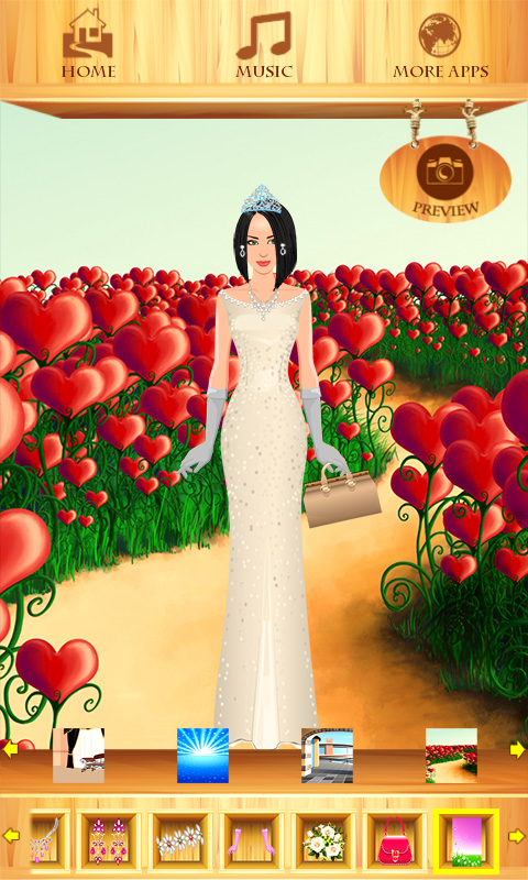 Choose a perfect combinations of all fashion accessories for her. After creating the wedding outfit for your fashion girl you can take a photo of her. Choose from the variety of cool backgrounds: romantic sunset, glorious flower gardens, beautiful castles. Make your bride happy and let her feel unique and the most luckiest in the world. In this fantastic fairy story there is a lot of wedding ideas, let yours be unforgettable. Practice your fashion designer skills and become the most popular stylist for brides, and maybe your creations will be on the cover of famous fashion magazines. This beauty game is for girls of all ages, and for everyone who like fashion.