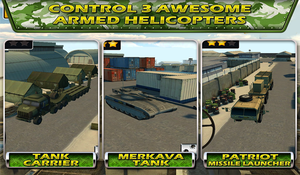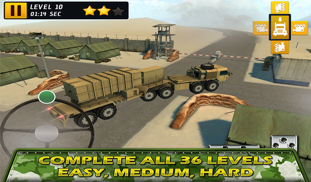 - 3 challenging modes to play with Easy (Merkava mark 4 tank), Medium (Heavy vehicle transporter truck), Hard (Patriot missile launcher)