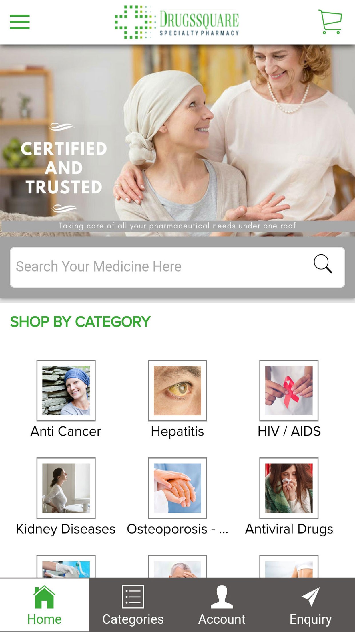 Drugssquare Pharmacy App is an extensive medical App that deals with all health related medicines like Cancer, Hepatitis, HIV-AIDS, Arthritis, Kidney Diseases, Asthma, Diabetes, Osteoporosis, Antiviral Drugs, Immunosuppressive Drugs, Anaesthetics, Birth Control Pills, Weight Loss and many more. Serving customers the right way makes us best in the market. We believe in providing the comfort to our customers and satisfaction of ordering online with us.