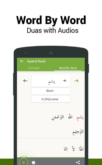 Word by Word is a special feature that lets the user to learn the correct pronunciation of Arabic words present in Ayahs, Surahs, and Duas
