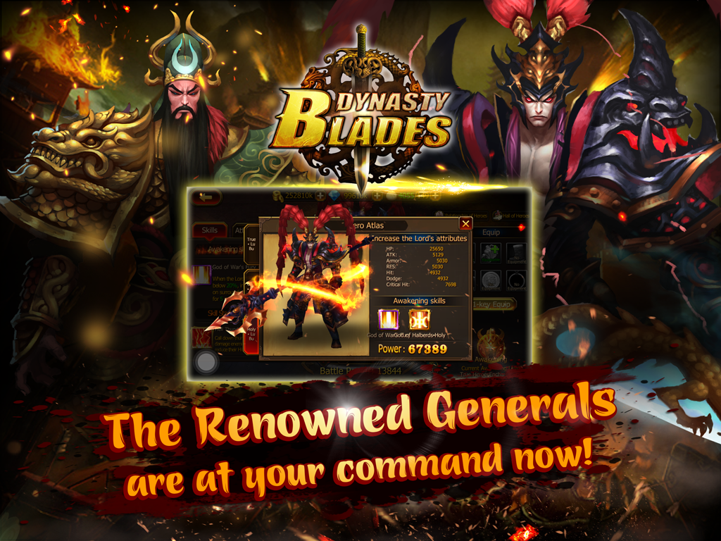 Assemble a mighty team of dynasty heroes(choosing heroes such as:Zhao Yun, Lu Bu, Cao Cao, Guan Yu, Zhang Fei, Liu Bei). Improve your team’s attributes with multiple gears.