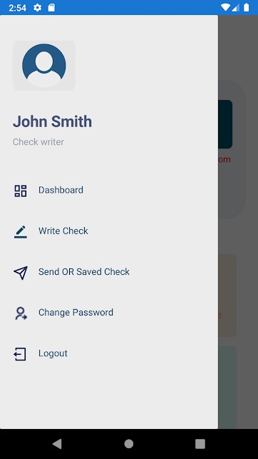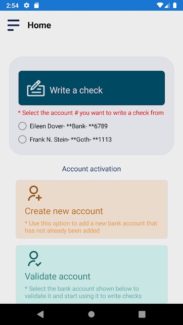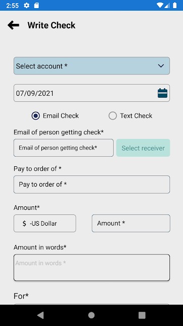After this first verification step, you will need to set up your electronic checkbook. In order to get your check from your bank you need to verify 2 remote deposits that only an owner of an account has access to, the bank information is verified by the bank and the user. This entire process takes between 5-10 minutes. The mobile app does not handle any transactions and does not keep any personal information. The emailacheck is like having a check book on your phone or computer. All transactions are handled by your bank. In order to write a check you need to have a passcode for your phone and then another passcode for the mobile app. In order to write the check you need to be the signor on the bank account and apply your signature each time, no signature is stored. The mobile app creates a unique personalized check each time with a barcode and repeating information in the background to prevent counterfeiting, manipulation, or forgery.