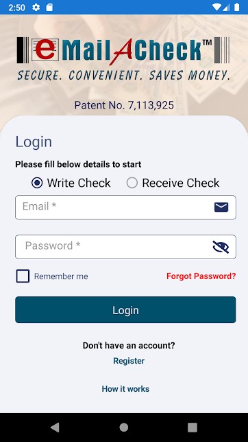 EMailACheck is a mobile App that allows you to write checks, and email or text them to someone you want to pay, instantly at practically no cost. A user downloads the eMailACheck mobile app. sets up the user's account (Account Name, Number and Bank information) all of the users information is first verified by text messages and emails.