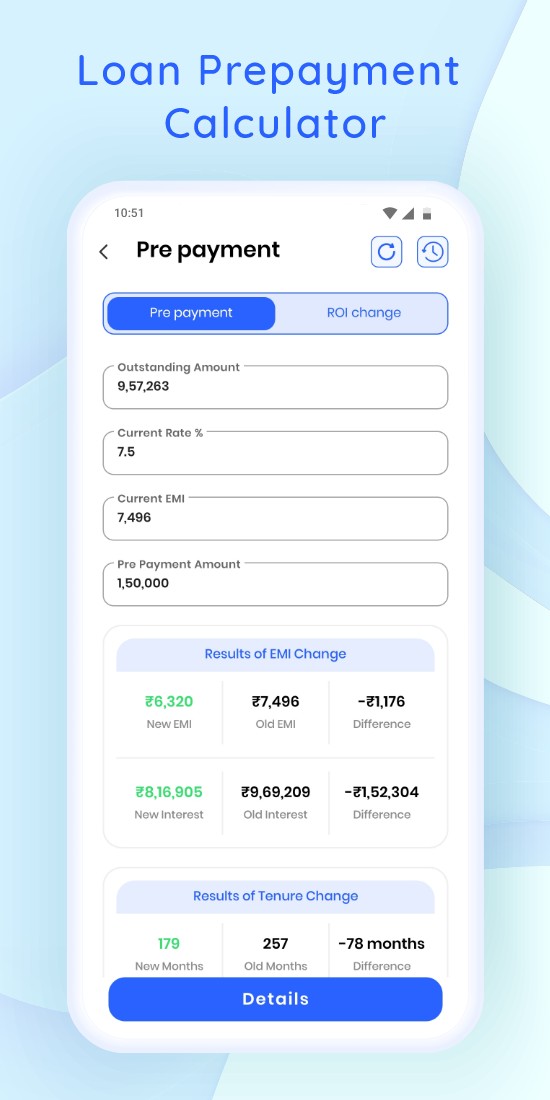 ~ Create inspiring future loan plans with new features to Calculate and compare the difference between EMI change and tenure change using Loan planner and find out EMI change in terms of ROI and Prepayment.