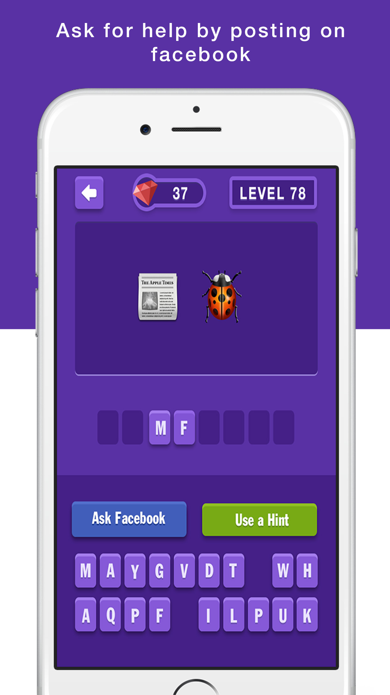 - Using this hint will reveal a random letter in the puzzle. Use this hint when you need an extra nudge to guess the icon on a hard question!