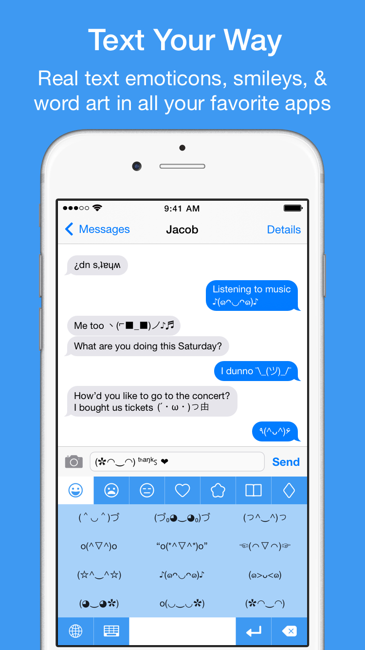• Now you can use real text emoticons, smileys, and word art in all your favorite apps, including Twitter, Facebook, Instagram, WhatsApp, and more!