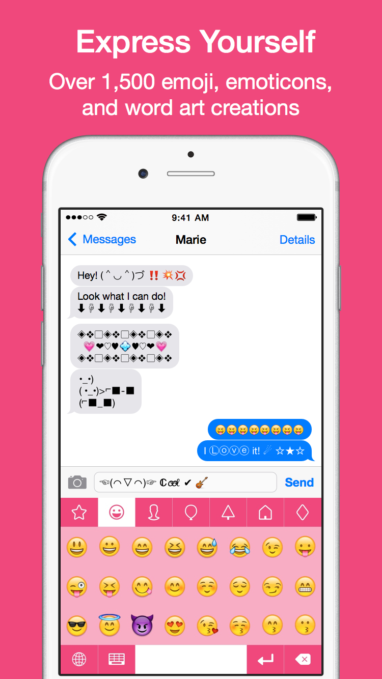 • Over 1,500 emoji, emoticons, symbols, and word art creations in a beautifully designed, system-wide keyboard for iPhone, iPad, and iPod touch