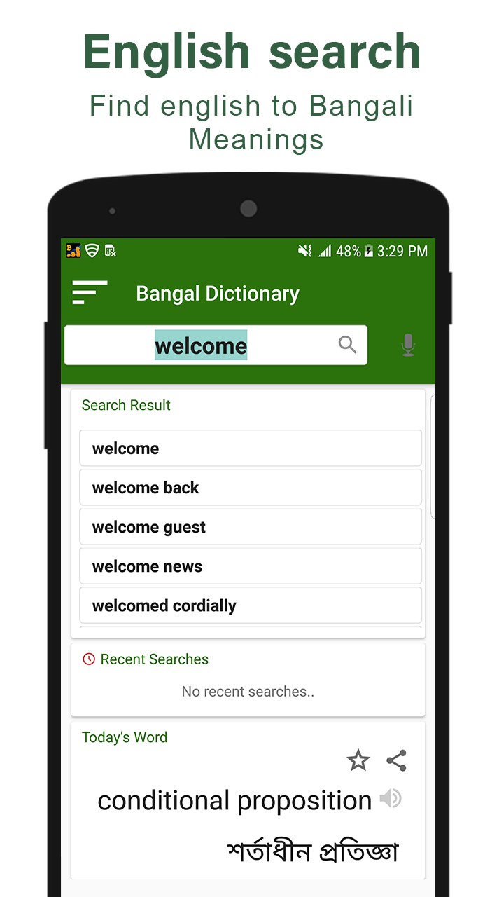 We provide you this Offline English to Bengali Dictionary in a new modern style in which you can search both English and Bengali words with their meanings. Free English to Bengali Dictionary is useful for learning English to Bengali translation and pronunciation of difficult words. The App gives meanings from English to Bengali and vice versa and also provides offline voice features. Therefore, those who want to find the meanings of difficult words in expected way; they can find Bengali meanings of English words and vice versa in this dictionary app.