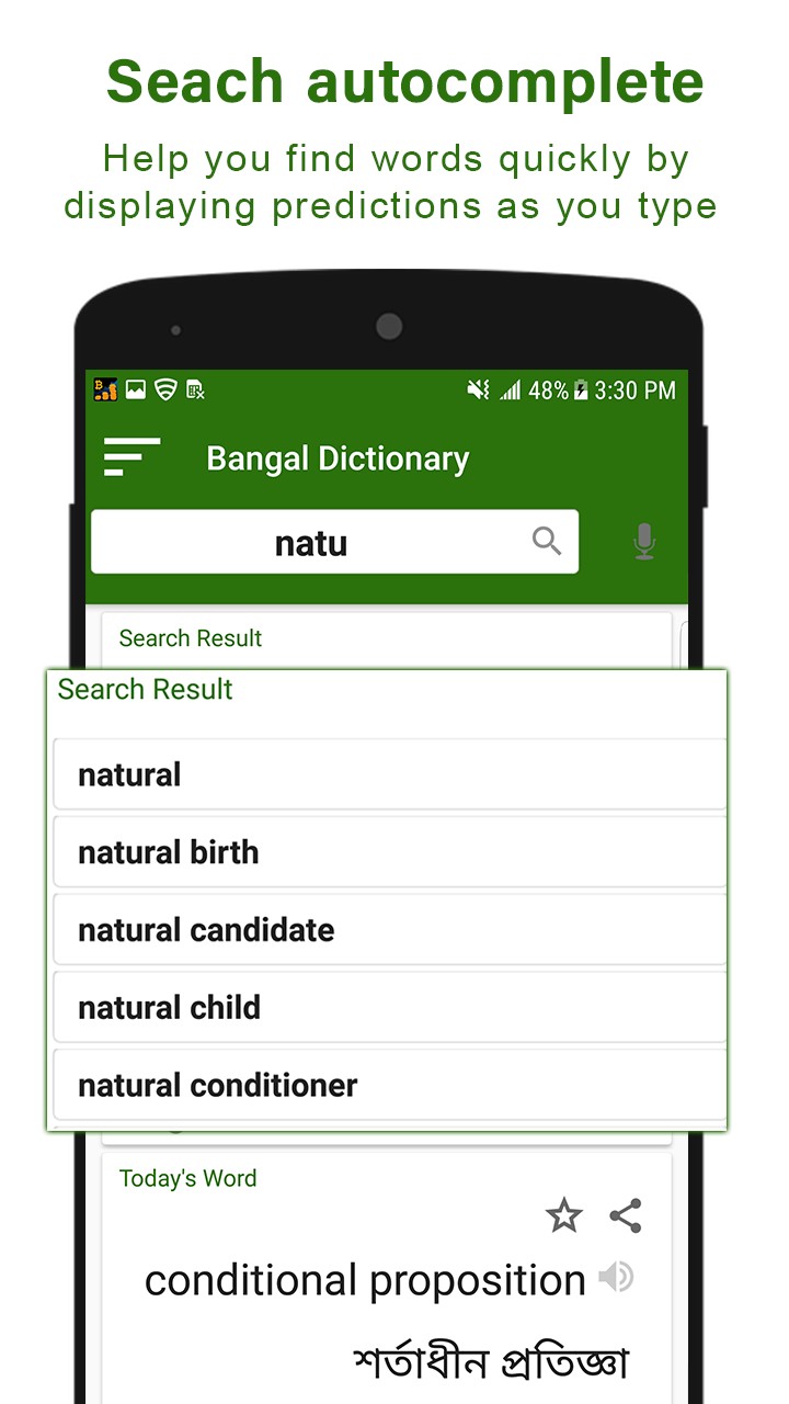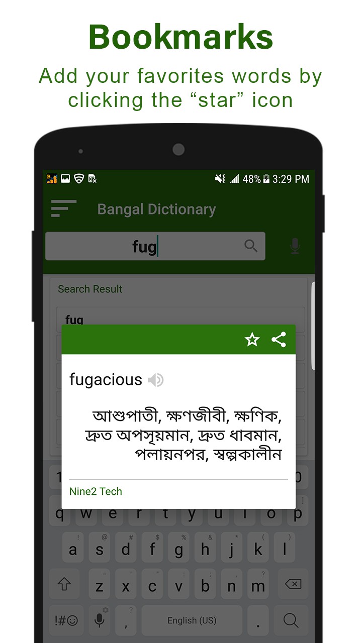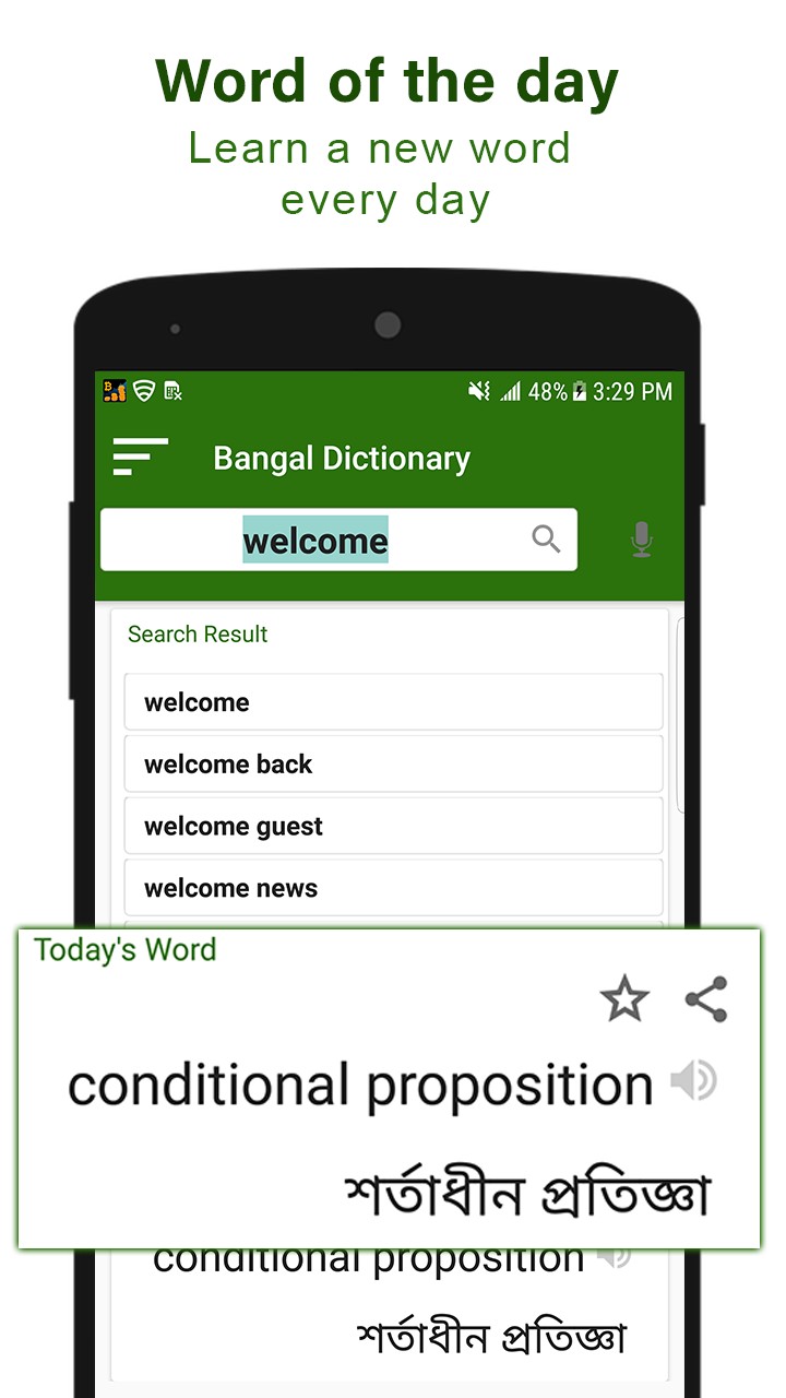 English Bengali Dictionary 2018 is not only a Dictionary but also a learning tool for you all. You can use this English to Bengali dictionary without internet anywhere. You don’t have to type full words with auto-complete feature. User will experience Speech to text feature in English to Bengali dictionary offline. You can bookmark or add words in favorites for study plan. English to Bengali best dictionary searches in database for words you type. This English Bengali dictionary provide explanation, equivalent words, synonyms, matching words, antonyms, with a full bunch of information about a single word.