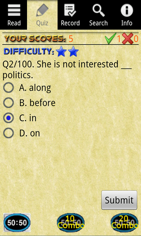 ★ DETAILED test result: It shows which questions you answered incorrectly, score, max. combo (Max. number of questions answered correctly consecutively), date and time of the test. Better still, it shows your top 30 frequent mistake questions too! It is useful for your revision and interesting to challenge with your friends!