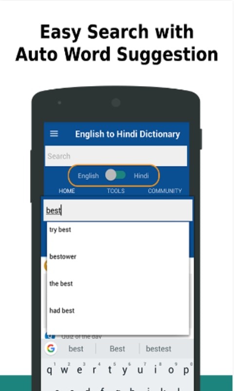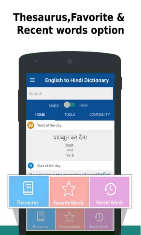 English to Hindi Dictionary is learning Android Application, designed to facilitate the Hindi speaking users who are keen to learn the meanings of English words in easy and interactive way. This dictionary can be used in two modes, one is English to Hindi, and another is Hindi to English that can be switched through easy tapping via arrow present on main home screen.