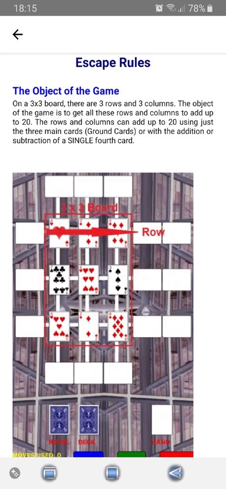 This card game is "Escape", a brand-new and entirely original form of Solitaire. Forget what you think you know. Unlike the versions of Solitaire everyone has already played, "Escape" presents an elegant little system for you to master, a game governed by logic, deduction, and foresight. You are tasked with solving a puzzle, cultivating a solution step by step, managing several variables at once, in a game governed by elementary math principles which creates something exciting and challenging. Much of the game involves manipulating the board of cards, moving cards around to better your position, serve your advantage, create opportunities, always while negotiating the odds of cards appearing that have not yet surfaced. Like chess, some moves require deep thinking and the need to reason several steps ahead. Some games, due to the randomness of the shuffle and deal, produce game play more akin to solving intricate brainteasers than the humdrum affair we commonly identify as Solitaire. Just when the pressure is building and opportunities, once boundless, narrow to pinpoints and the walls are closing in around you, you find your way out, escaping by the skin of your teeth. I am so glad you're along for the ride. I know you're up to the challenge.