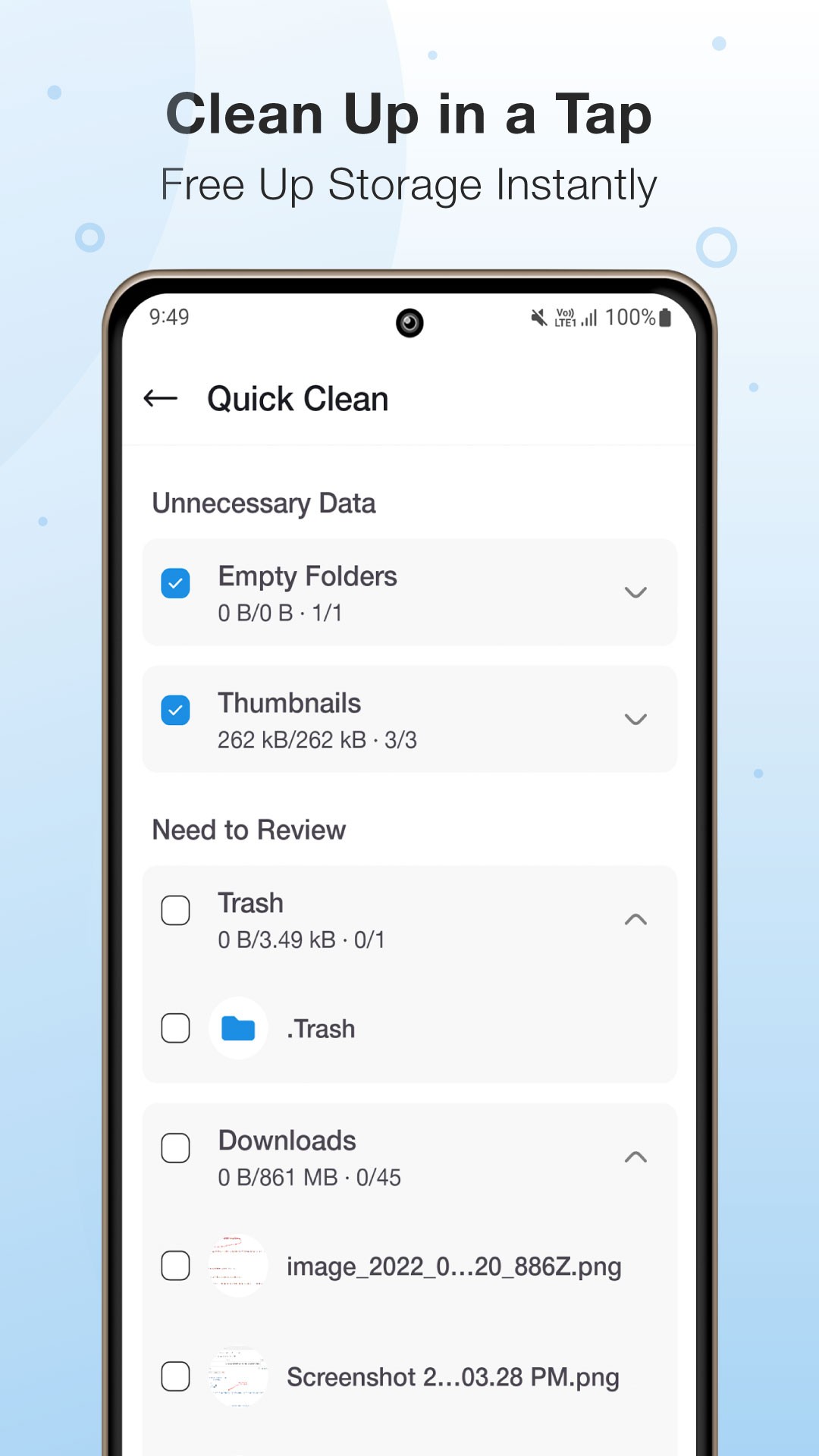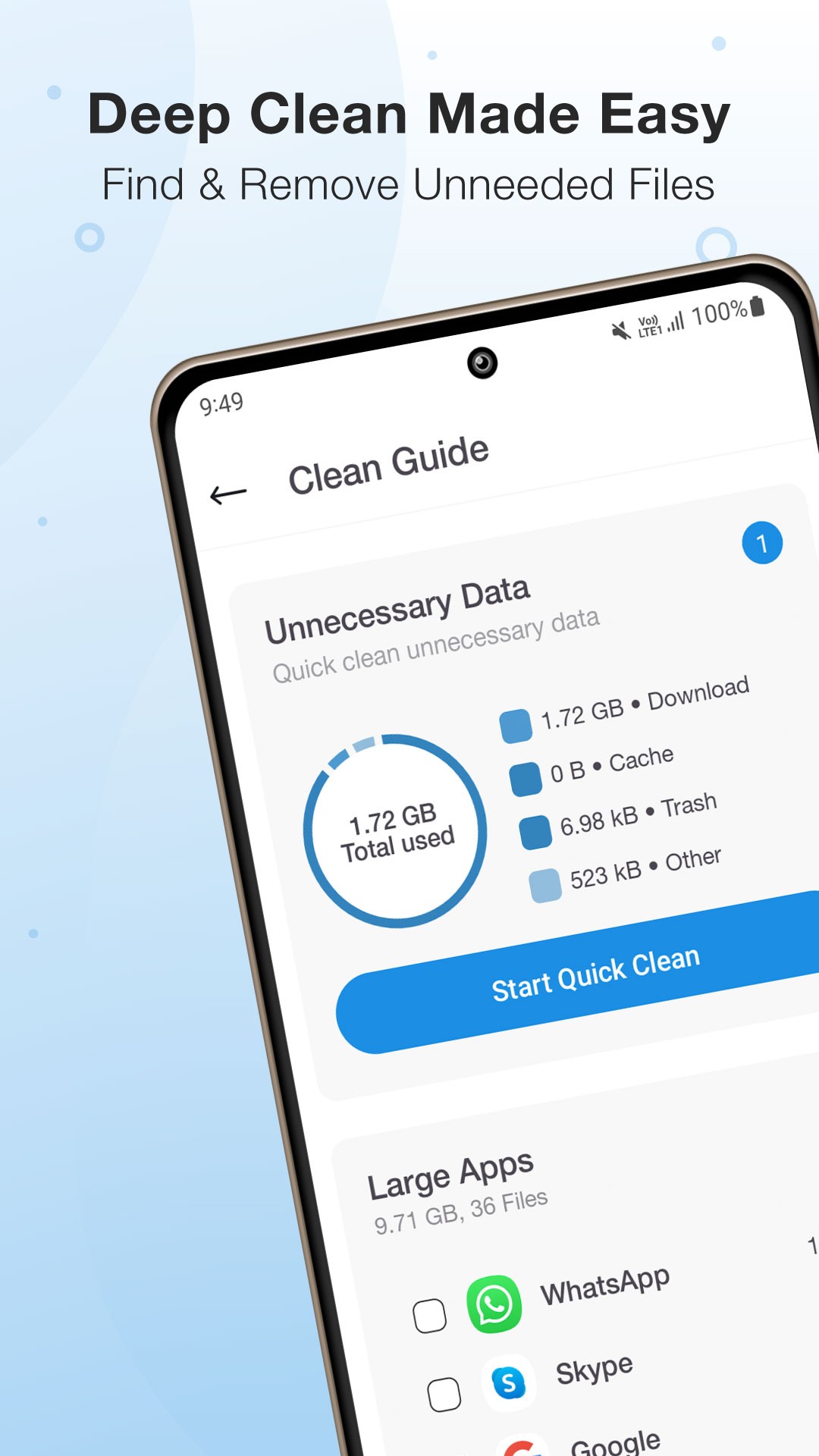 One-Tap Clean: Easily remove temporary files, app cache, and browsing history with a single tap.